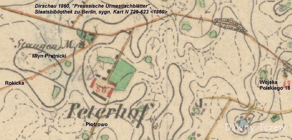 Dodam, że jest też prawdopodobnie błąd w książce Fr. Schultza ("Geschichte des Kreises Dirschau", s. 220), który Piotrowo przypisuje Bertlingowi i Daehnke, podczas gdy oni "władali" sąsiednim Tczewskim Polem (teren koszar). Problem jest taki, że nie wszystkie księgi adresowe uwzględniają Peterhof po 1880 r. i do pocz. XX w. jest luka informacyjna. Na Piotrowie po Jantzenie, którego księga statystyczno-topograficzna Prus Zachodnich z 1858 r. (s. 114) wymienia jako jednego z największych właścicieli ziemskich w Tczewie i również podaje wyraźną nazwę: "Peterhoff", gospodarowali na pewno masoni - Heinrich Schwenk, po nim m.in. Arthur Rojahn. W czasach II RP należał on do polskich właścicieli, których wymieniła Zunia.