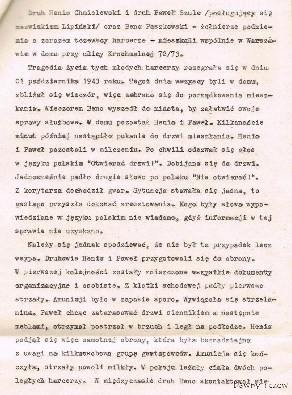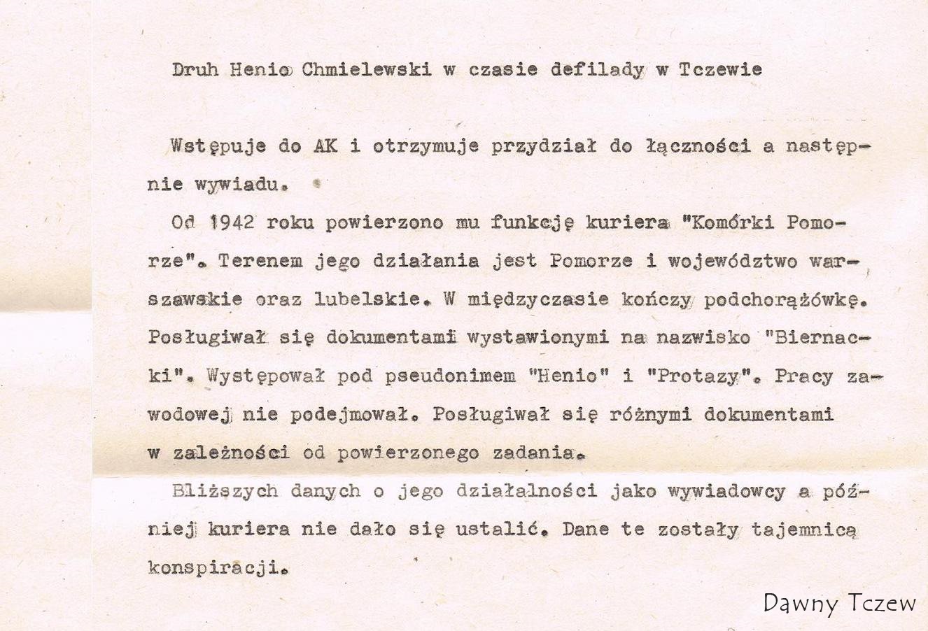 Kazimierz Smoliński pisze:Henryk Chmielewski ps. "Biernach" ur. 16.08.1922r w Tczewie, zginął 2.10.1943r w Warszawie na Pawiaku po ciężkich torturach. Absolwent Państwowego Gimnazjum Mechanicznego w Tczewie w 1939r. Harcerz III szkolnej drużyny im. Króla Jana Sobieskiego. motto " Wiara nasza silą"