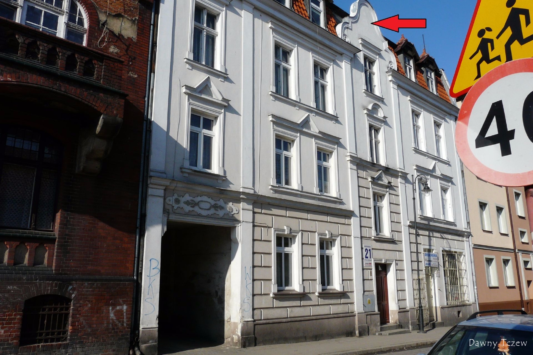 Widać zarys kamienicy na miejscu której dziś stoi "blokowy klocek".