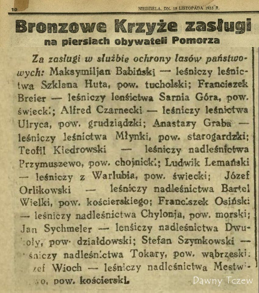 Dziadek leśniczym został po wojnie. Zachowało się po nim mnóstwo papierów i dokumentów. Leśniczym był w Dębowie, aż do swojej śmierci. W czasie wojny był w 65 starogardzkim pułku piechoty.18.09.1939 pod Iłowem wzięty został do niewoli która do 16.11.1940 spędzał w Luckenwalde Stalag III A. Po wypisaniu ze stalagu, do końca wojny był na robotach przymusowych w miejscowości Knoblauc. Leśnictwo było tradycją w mojej rodzinie