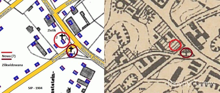 To by się zgadzało, bo na miejscu posesji nr 14 i 14b (Zielik) znajdował się dawniej ogród w sąsiedztwie karczmy, gdzie miał zostać udostępniony grunt pod przenoszoną kapliczkę (por. viewtopic.php?t=1668#p26181). Widać to wyraźnie na załączonej wyżej mapie z 1909 r.niespokojna66 pisze: ↑20 sty 2013, o 15:32W 1937 roku , " Boża Męka " stała w okolicach obecnego sklepu "Zielik" na Wojska Polskiego,miała ściankę w kształcie półkola.be-good pisze:W nawiązaniu do Bożej Męki z ulicy Skarszewskiej - jednak w 1911 roku wzięto się za jej odbudowę, choć w innym miejscu: