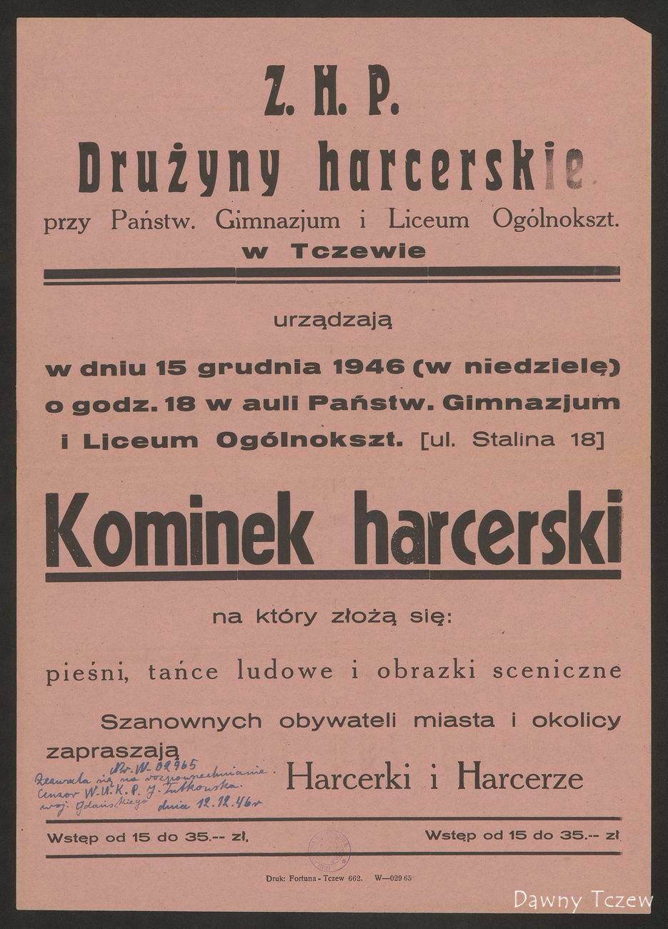 Kolejna masa powojennych wydarzeń w auli gimnazjum. Wygląda na to, że w trakcie remontu Hali Miejskiej to szkoła spełniała rolę centrum kultury wszelakiej.. (polona.pl)