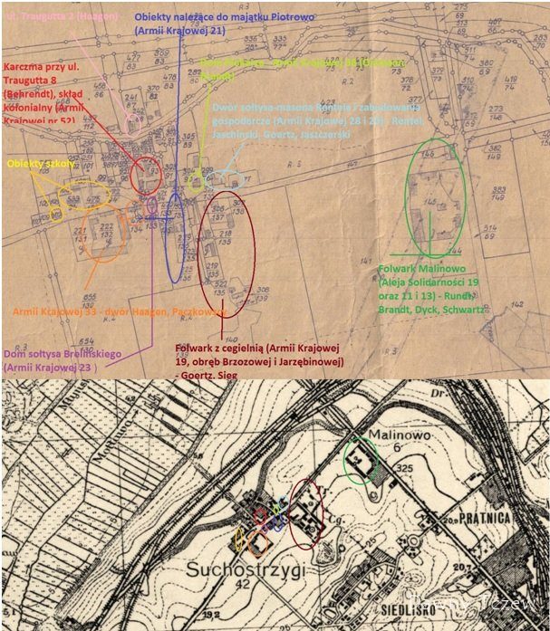 Do kogo później należały ziemie Wilhelma Schultza, wymienionego w księdze adresowej z 1858 r., nie udało się w świetle dostępnych źródeł ustalić. Niewykluczone, że były to parcele, które rodzina Haagen sprzedała Weissom i Jaschinskim; albo ziemie Jana Rogowskiego, przyłączone do Malinowa a później do Piotrowa. Odpowiedź prawdopodobnie znajduje się w starych księgach gruntowych Suchostrzyg.