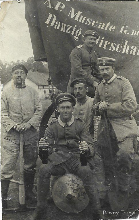Żołnierze z jednostki lotniczej, Tczew (Dirschau), Gdańsk (Danzig), Prusy Zachodnie. W tle plandeka z nazwą firmy A. P. Muscate GmbH. To znany producent maszyn rolniczych, kotłów i maszyn parowych z Tczewa. Niewielkie, miękkie zdjęcie. Wykonane ok. 1916-1918 r. Odwrocie - czyste, ze śladami odklejania z albumu.