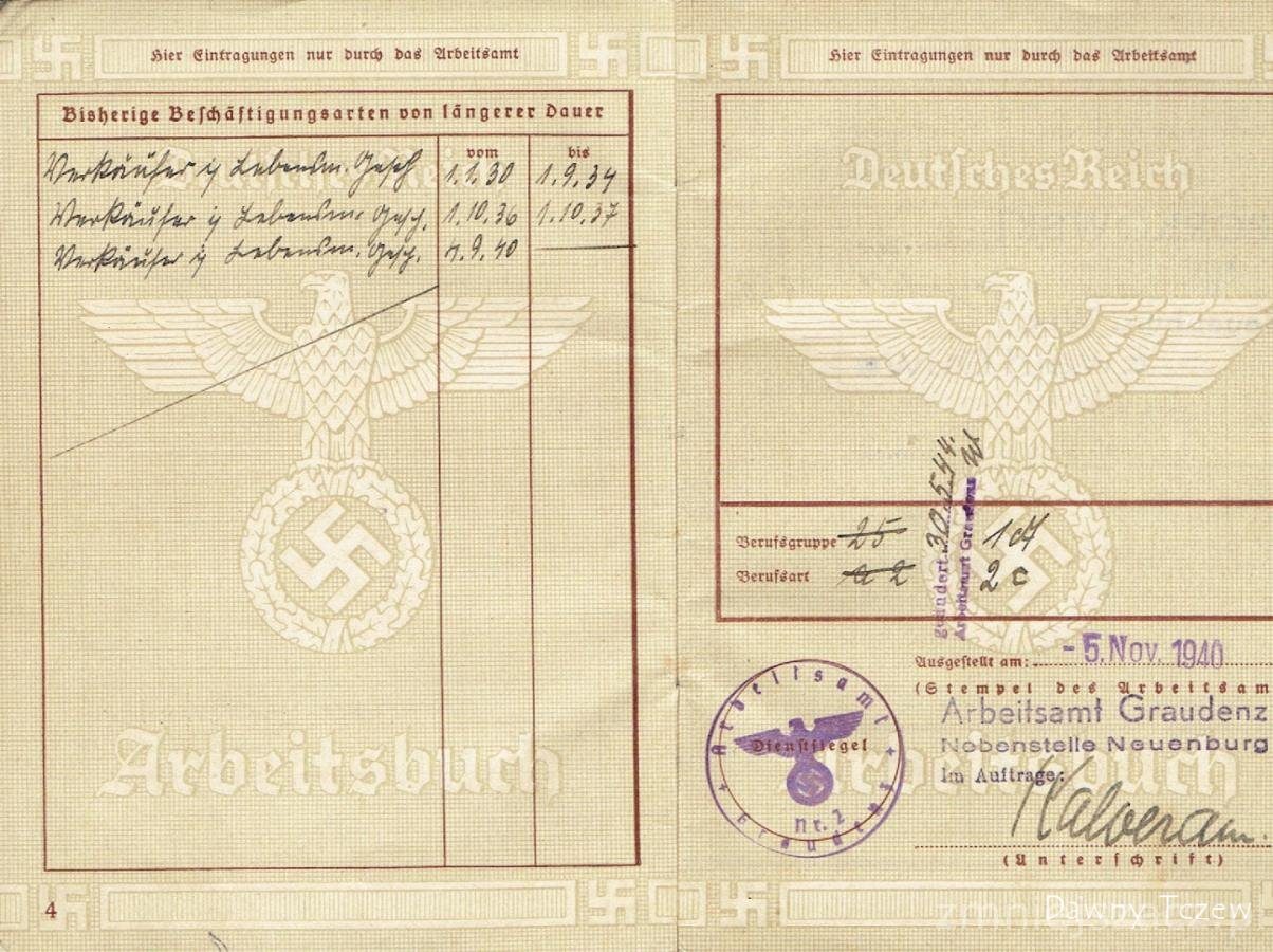 W nawiązaniu do poprzedniego postu, udało mi się przetłumaczyć wpisy do "Arbeitsbuch" mojego ojca Zygmunta .Strona 2 : Data urodzenia 15 lipca 1915, miejsce urodzenia Kościelna Jania ( od 26.10.1939 - Kirchenjahn , od 1940 roku Kirchberg ), obywatelstwo polskie, stan rodzinny- wolny, miejsce zamieszkania - Bzowo, pow. Świecie.