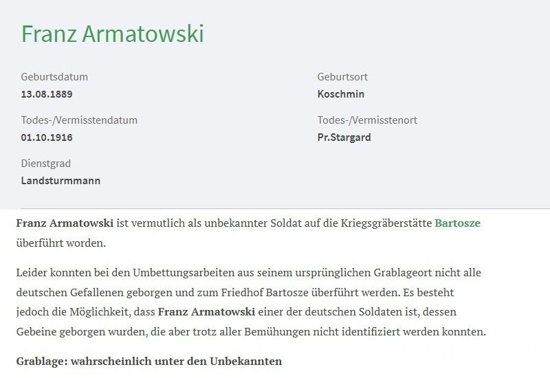 Wolny przekład : Franz Armatowski został prawdopodobnie przeniesiony na cmentarz wojenny w m. Bartosze jako nieznany żołnierz.