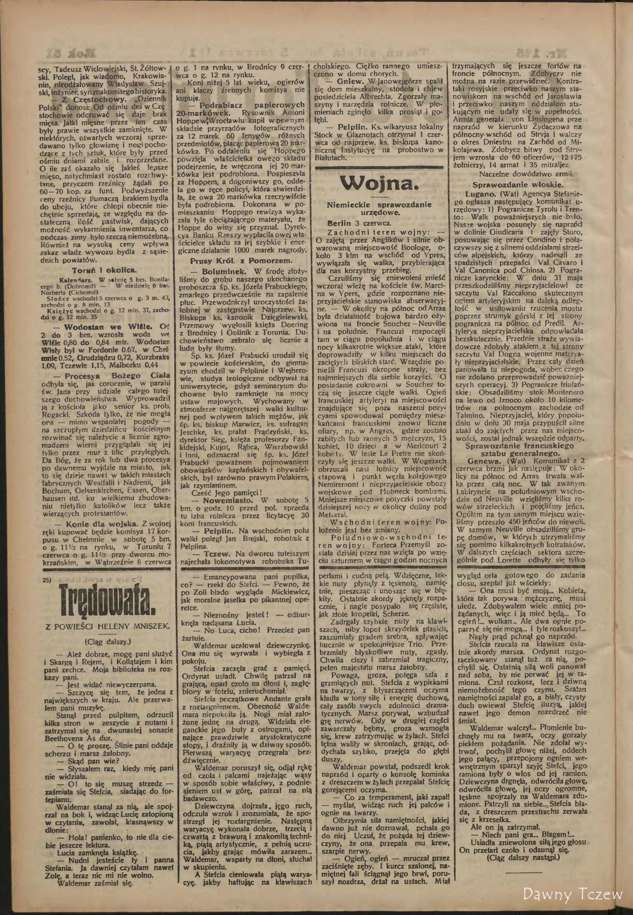— Pociągi nadzwyczajne. Na liniach kolejowych z Szarlotenburga przez Piłę, Tczew do Wystrucia, dalej z Szarlotenburga przez Poznań do Torunia oraz z Poznania przez Piłę do Torunia kursować będą przed Zielonemi Świątkami w dniach od 1 do 8 czerwca rb. pociągi nadzwyczajne. Rozkłady tych pociągów wywieszone są na dworcach kolejowych.
