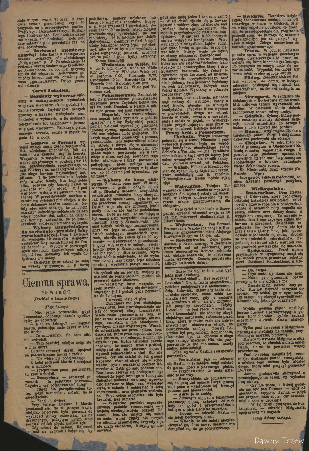 — Tczew. Na tutejszym dworcu krótko przed nadejściem pociąga przejściowego z Berlina, złodzieje kieszonkowi korzystając z natłoku, skradli mistrzowi blacharskiemu p. Kalince z Drezna portmonetkę z 122 mk., a mistrzowi rzeźnickiemu Mennigowi z Steglltz pod Berlinem portmonetkę z