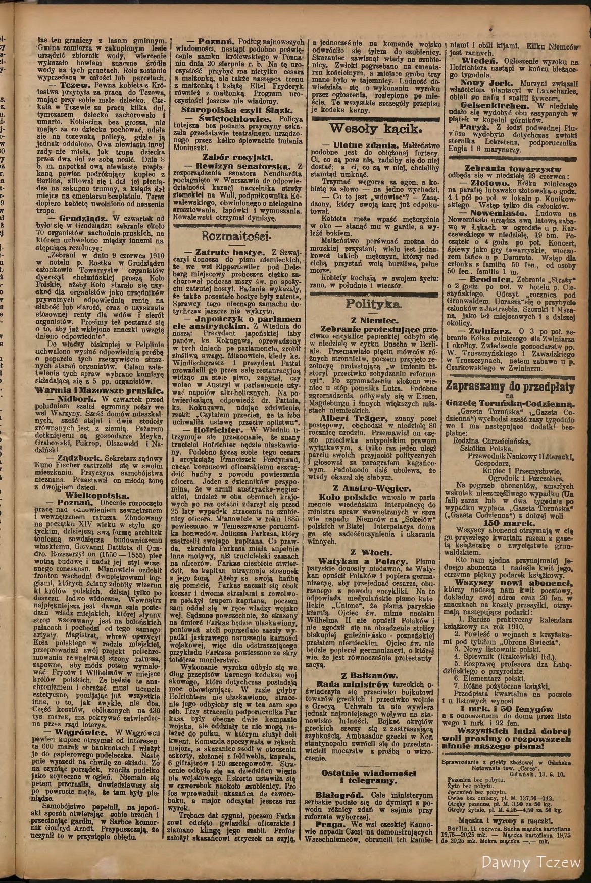 - Tczew. Pewna kobieta Królestwa przybyła za pracą do Tczewa, mając przy sobie małe dziecko. Czekała w Tczewie za pracą kilka dni, tymczasem dziecko zachorowało i umarło. Kobiecina bez grosza, nie mając za co dziecka pochować udała się na tczewską policyę, gdzie ją jednak oddalono. Owa niewiasta innej rady nie miała. jak trupa dziecka przez dwa dni ze sobą nosić. Dnia 8 b. m. napotkał ową niewiastę rozpłakaną pewien podróżujący kupiec z Berlina, zlitował się i dał jej pieniądze na zakupno trumny, a ksiądz dał miejsce na cmentarzu bezpłatnie. Teraz dopiero kobietę uwolniono od noszenia trupa.