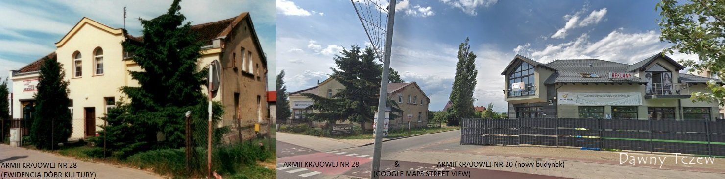 Uwagi: Dawny, dość okazały dworek przy AK nr 28 został wybudowany według karty ewidencji zabytku ok. 1880 r. W tym układzie był siedzibą właściciela ziemskiego Gustava Rentela, członka loży masońskiej "Augusta zur Unsterblichkeit" w Starogardzie Gdańskim, który znalazł się w tym czasie w gronie współzałożycieli tczewskiego klubu wolnomularskiego na ob. Westerplatte 3. Działkę z małym budynkiem na ob. ul. AK nr 20 kupił od Ortmannów. Był wieloletnim sołtysem/wójtem Suchostrzyg (Ortvorsteher). Po śmierci "farmazyna" jego majątek został rozparcelowany - ziemie przy Czatkowskiej trafiły później do cegielni Steffena, inne nabył już wtedy Emil Goertz, który o zakup dworku i pozostałych zabudowań pokusił się dopiero w 1913 r. Ostatnim przedwojennym właścicielem domu przy AK nr 28 był oberżysta Jan Jaszczerski. Jego zawód wskazywał na to, iż w budynku została umieszczona karczma. Być może właśnie dlatego powstał błąd w karcie ewidencji zabytku, że w czasach II RP funkcjonowała w tym obiekcie szkoła. Dla potrzeb szkolnych na Suchostrzygach była używana karczma, ale ta należąca wcześniej do Behrendta (ob. Traugutta 8) i nie było to w czasach II RP, lecz po II wojnie światowej. Tak czy inaczej, czyżby na Suchostrzygach były przed wojną wciąż aktywne dwie oberże?