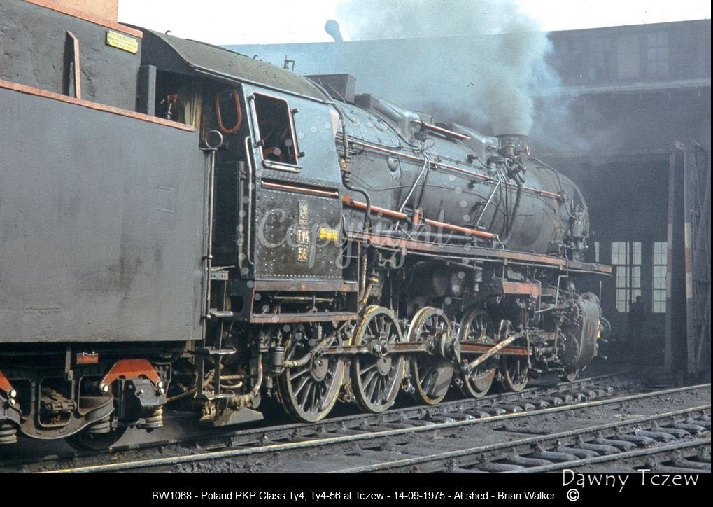 Autor napisał: "W chwilę po przyjeździe "pendla" z pracownikami stacji i lokomotywowni Zajączkowo Tczewskie cztery parowozy Ty2 i jeden Ty42 spięte razem i będące pod parą dojeżdżają w perony stacji Tczew, aby z żurawia wodnego napełnić tendry wszystkich parowozów. Czynne parowozy stacjonujące na "Zającu" musiały tego dnia wodować się w stacji Tczew ze względu na remont wodociągów. Od lewej : Ty2-366,582,1124,1153 i Ty42-22".