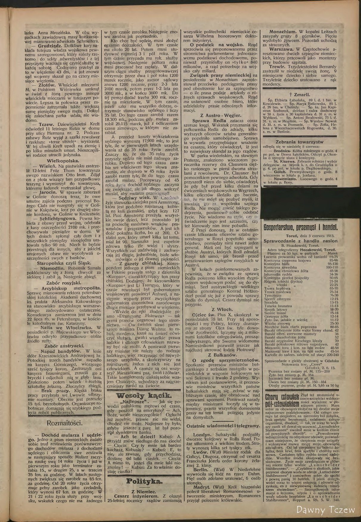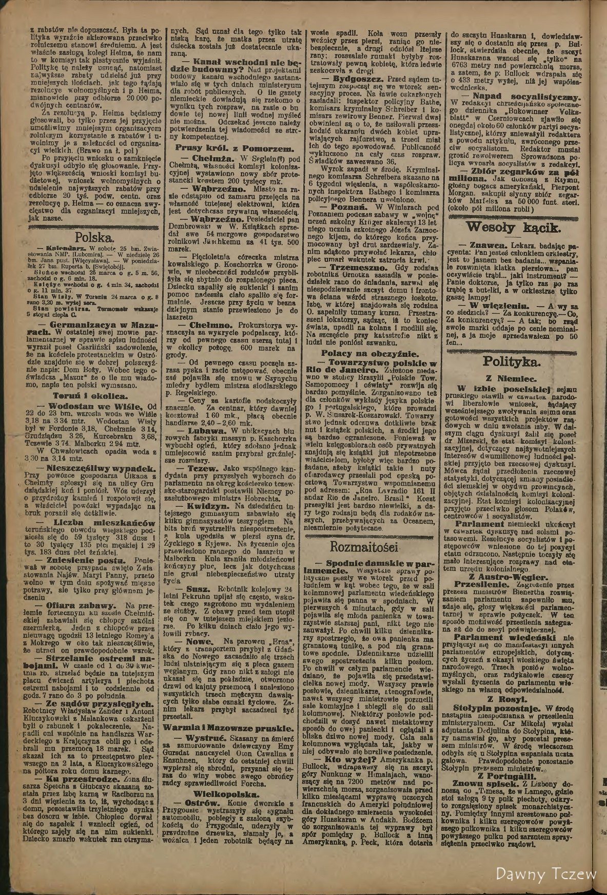 — Tczew. Dziewięcioletni Kreft odwiedził 11 letniego Rutza w domu przy ulicy Hermana nr. 2. Podczas zabawy Rutz wyjął z szafki rewolwer i rzekłszy: «teraz strzelę» wystrzelił. W tej chwili Kreft upadł na ziemię i po kilku minutach umarł. Nieszczęśliwi rodzice utracili jedynaka.