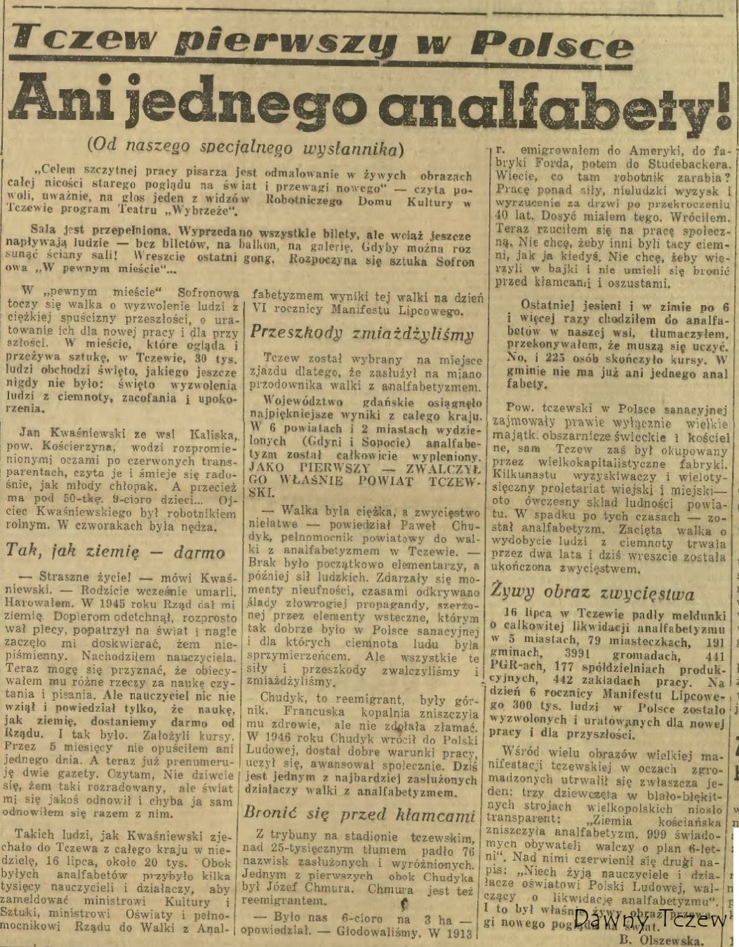 http://www.ksiaznicapodlaska.pl/site/bi ... p13_14.pdf Fragmenty z „Dziennika Bałtyckiego”: A tak z entuzjazmem opisało to wydarzenie „Życie Radomskie nr 197 z 19 lipca 1950 r” Oficjalnie (w propagandzie ) akcja zakończyła się wielkim sukcesem, natomiast w praktyce krótkie kursy nie zawsze przynosiły oczekiwane efekty. Jeszcze w latach 70. XX wieku, można było spotkać starsze osoby, które nie potrafiły się podpisać i na dokumentach stawiały krzyżyki .„ W niedzielę, dnia 16 lipca 1950 r. odbyło się pierwsze publiczne podsumowanie wyników walki z analfabetyzmem na ogólnopolskim zjeździe w Tczewie. Przybyli tam minister kultury i sztuki S. Dybowski, pełnomocnik rządu do spraw walki z analfabetyzmem S. Matuszewski, liczni przedstawiciele organizacji młodzieżowych i społecznych oraz wszyscy pełnomocnicy wojewódzcy, a także delegaci tych powiatów, które pierwsze wykonały swe zadania. Tczew był przodującym miastem Wybrzeża w walce z analfabetyzmem i z tego względu stał się miejscem 25. tys. manifestacji z okazji jego zlikwidowania. Ogółem w tym dniu meldunki o zakończeniu akcji likwidacji analfabetyzmu złożyło 18 powiatów, 5 miast, 79 miasteczek, 191 gmin, 3 991 gromad, 441 Państwowych Gospodarstw Rolnych, 177 spółdzielni produkcyjnych i 442 zakłady pracy. Na zakończenie manifestacji minister Matuszewski wręczył nagrody pieniężne 76 najbardziej wyróżniającym się w akcji zwalczania analfabetyzmu aktywistom i nauczycielom