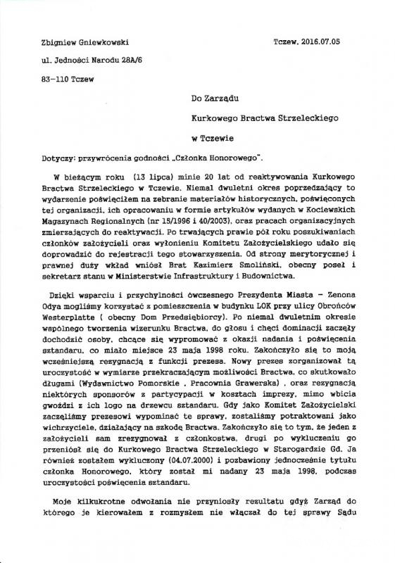 Załączam moje pismo, w którym zwróciłem się po raz kolejny o przywrócenie godności członka honorowego Bractwa, Mimo upływu prawie 4 miesięcy, nie ma na nie żadnej reakcji. Może należałoby wręczyć je osobiście do rąk Zarządu.