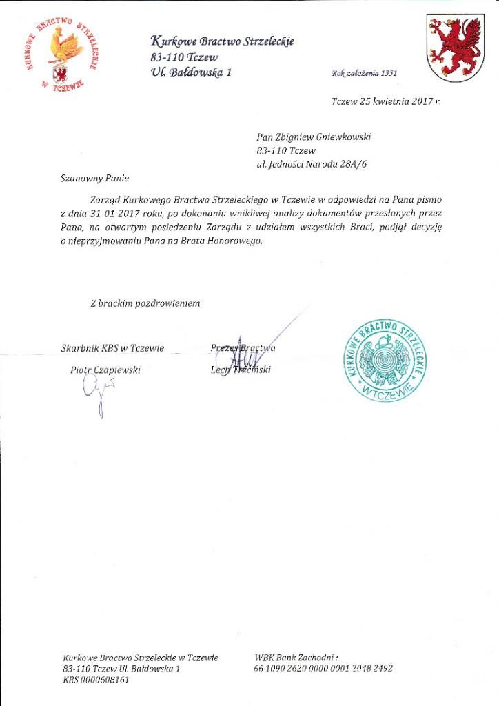 W trakcie kilkumiesięcznej batalii o przywrócenie godności członka honorowego przedstawiłem na życzenie Zarządu dodatkowe dokumenty i materiały świadczące o moim wkładzie w reaktywację Bractwa. Niestety opór materii był tak duży, że okazało się to stratą czasu z mojej strony. W efekcie otrzymałem enigmatyczną odpowiedź, którą załączam.