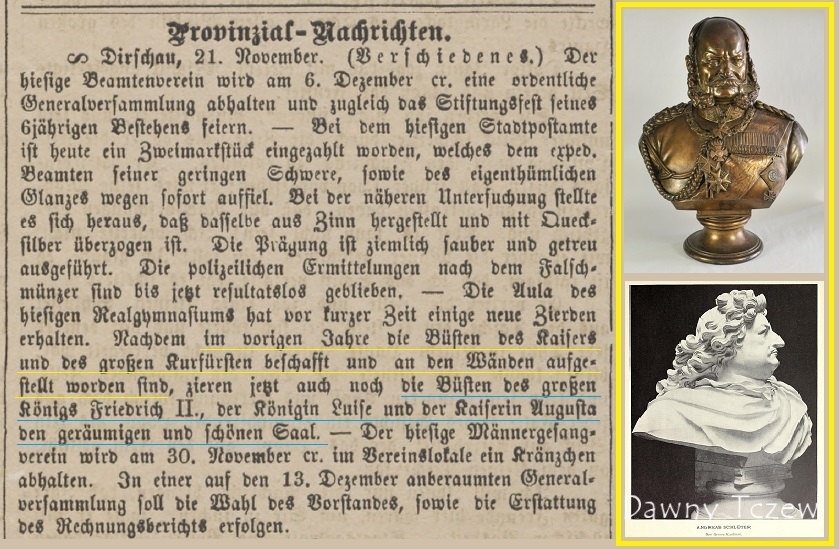 Nie pada powyżej, co prawda, pojęcie "wnęk", ale myślę że jesteśmy teraz wyjątkowo bliscy pewności, co do tego, czyje facjaty witały przy wejściu do szkoły gimnazjalistów ponad 130 lat temu...(...) Aula tutejszego Realgymnasium otrzymała niedawno nowe ozdoby. Po tym jak w zeszłym roku zorganizowano i umieszczono na ścianach popiersia Cesarza i Wielkiego Elektora, tą przestronną i piękną salę zdobią teraz również popiersia Wielkiego Króla Fryderyka II, Królowej Luizy oraz Cesarzowej Augusty(...)