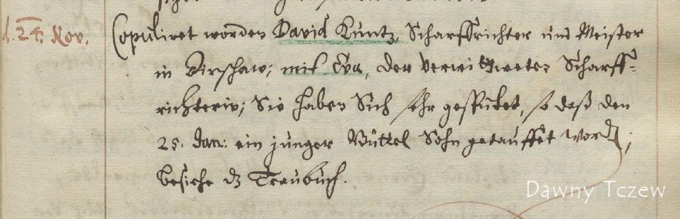 Tczew 24 listopad 1687. Kat Tczewa Dawid Kuntz ożenił się z Ewą, wdową po kacie.
