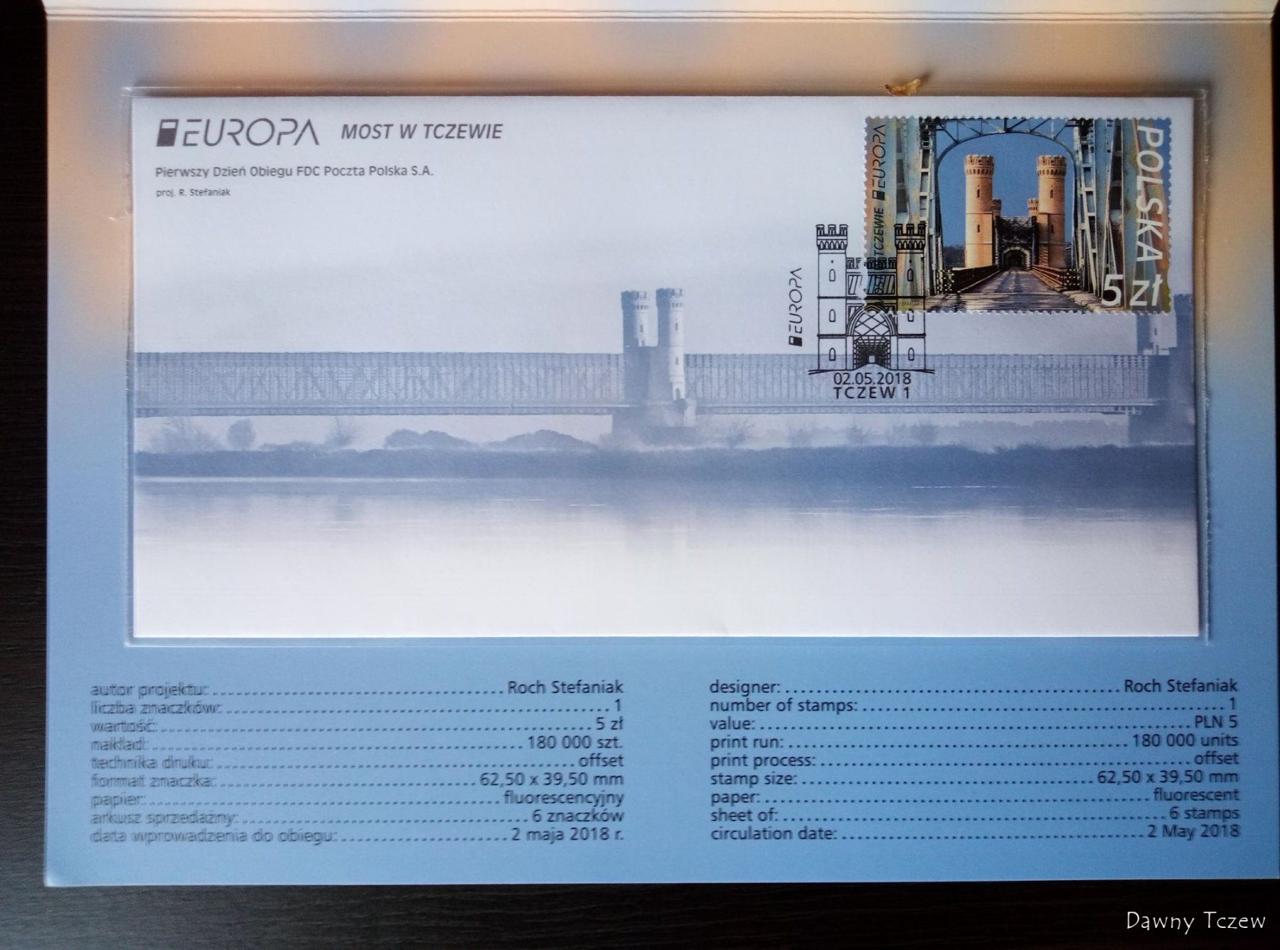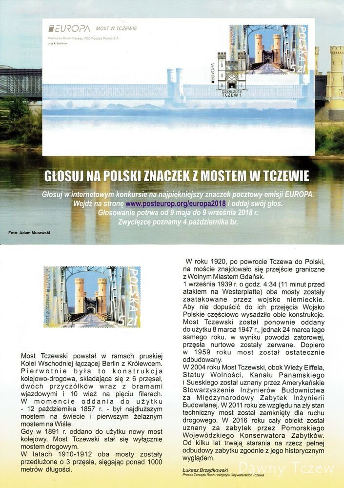(...) Polska praca walczy o miano najpiękniejszego znaczka pocztowego w prestiżowym konkursie filatelistycznym EUROPA 2018. W tym roku motywem przewodnim są mosty, a projekt autorstwa Rocha Stefaniaka, przedstawia zabytkową przeprawę w Tczewie (...).