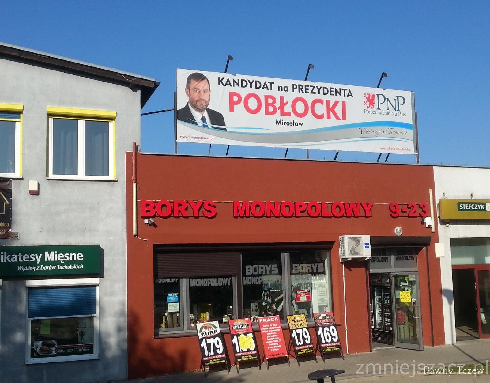 W przedwyborczej gorączce różne akcje reklamowe wymyślają kandydaci na radnych ( lub ich kluby). Będąc dzisiaj na Suchostrzygach pozwoliłem sobie uwiecznić na fotografii swoistą symbiozę kandydata na Prezydenta Tczewa ze sklepem monopolowym. Czyżby nie było już innego miejsca na banery ( są jeszcze na przykład wieże ciśnień).