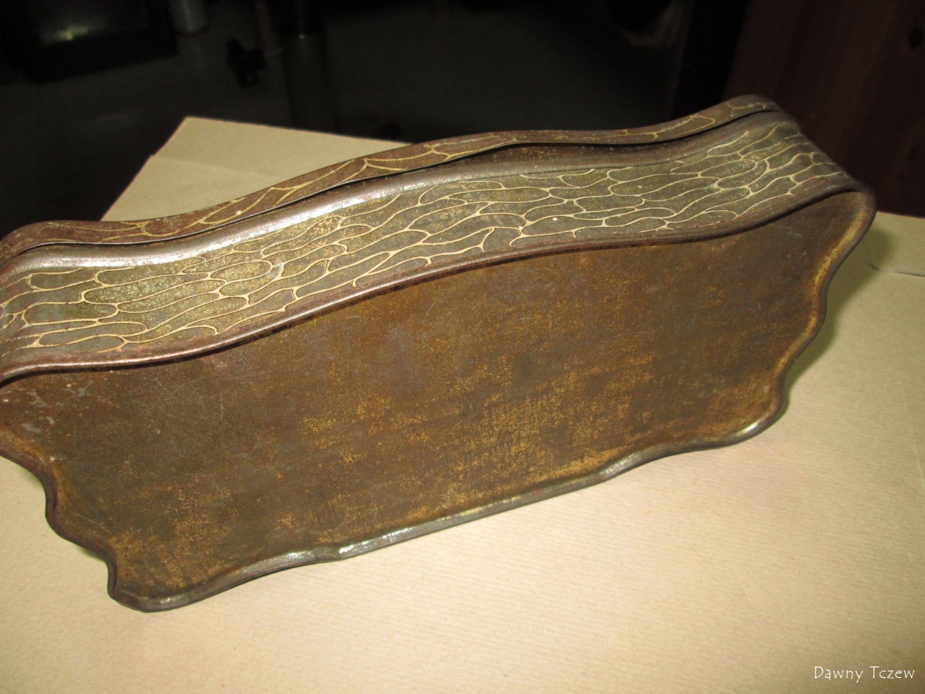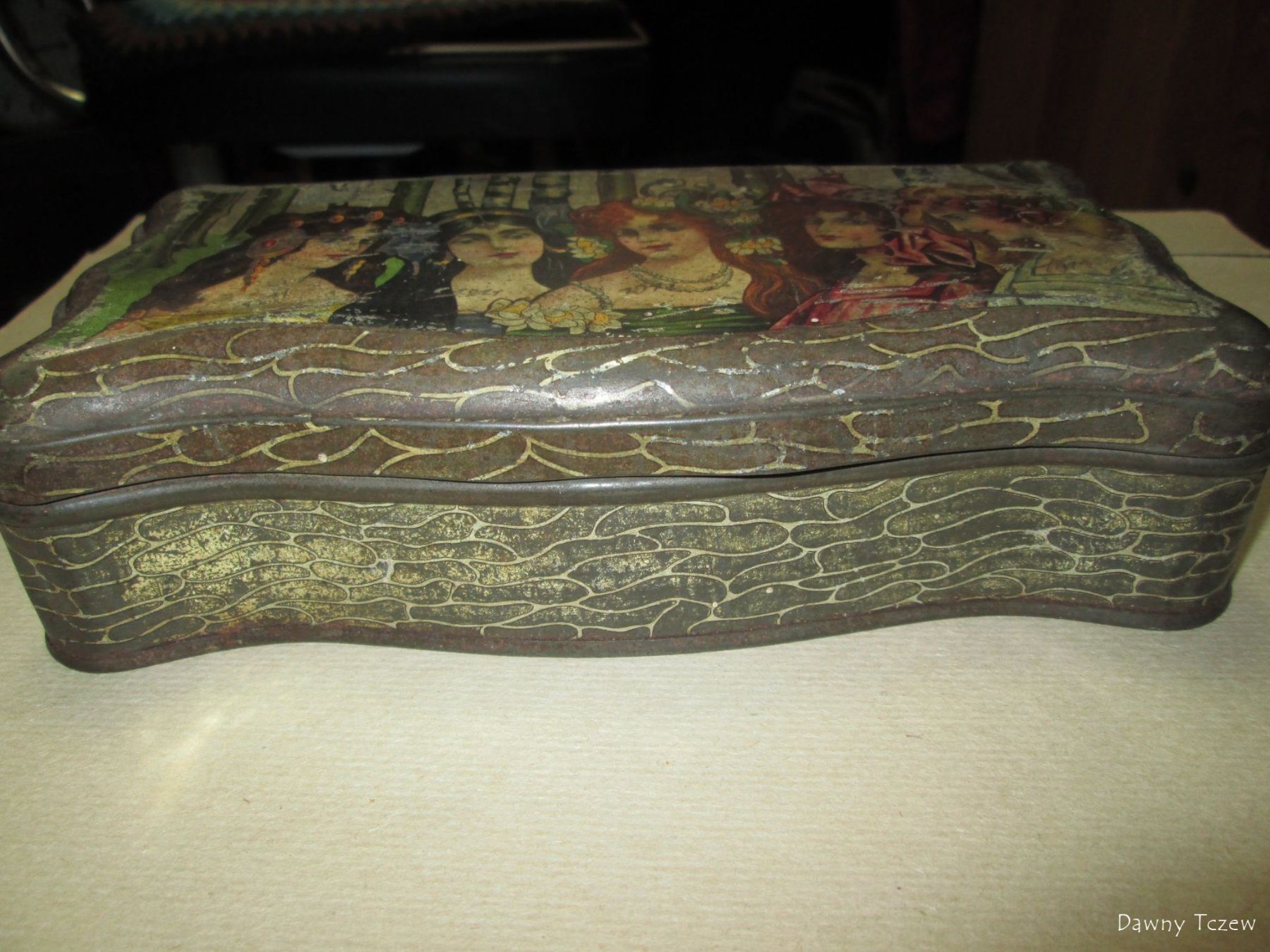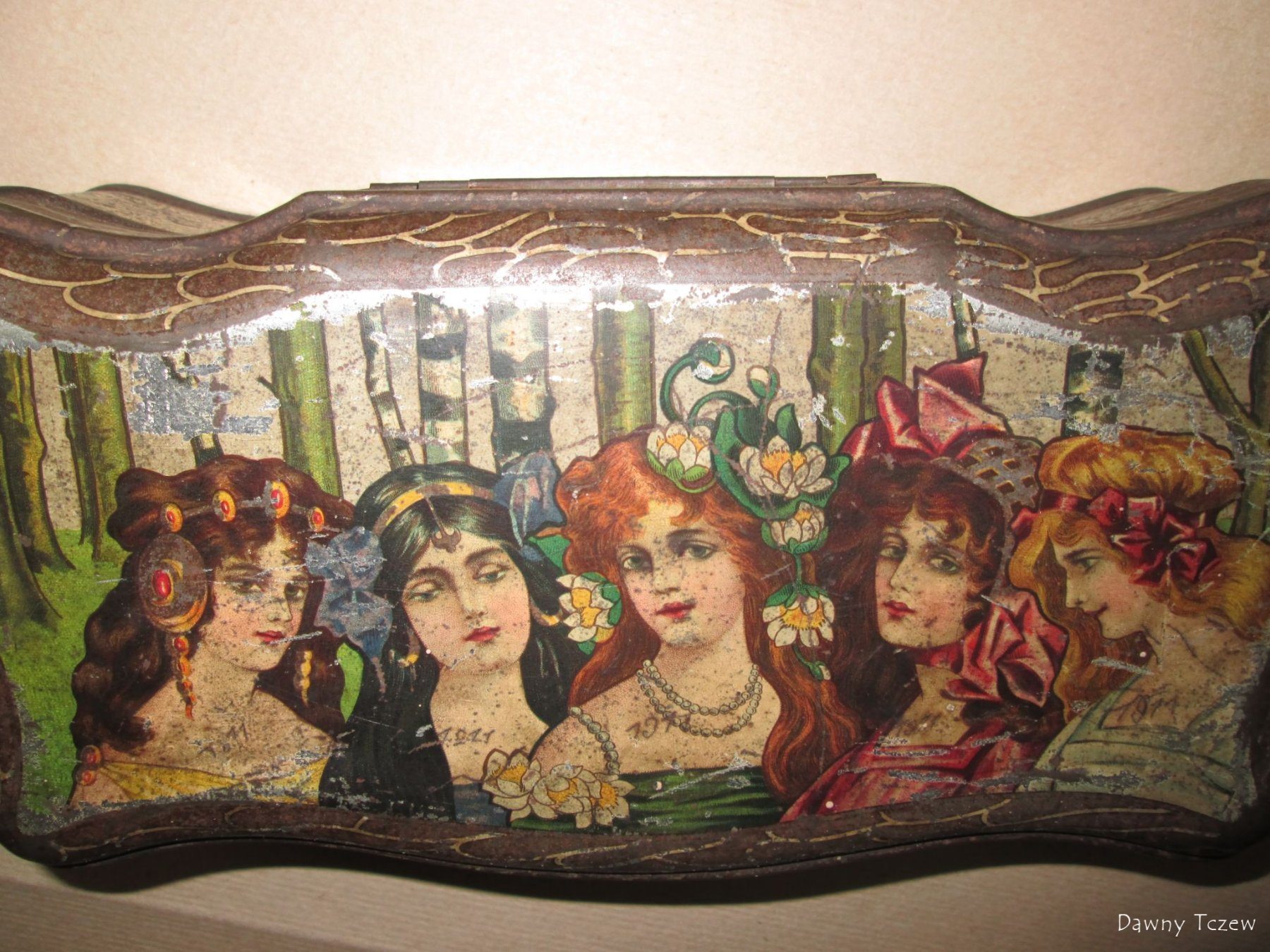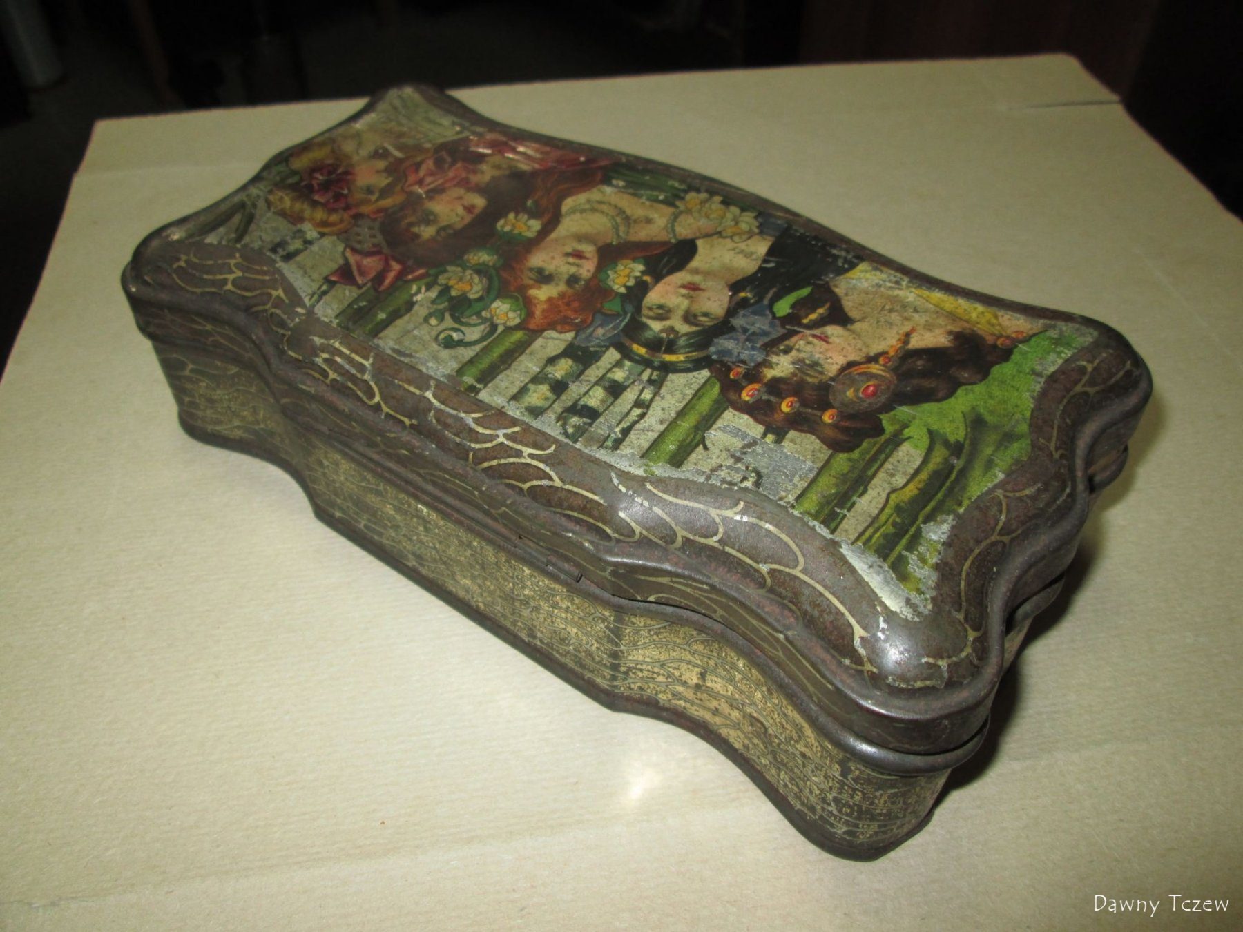 Kolejna bogato malowana puszka po słodkościach wystawiona na aukcji.