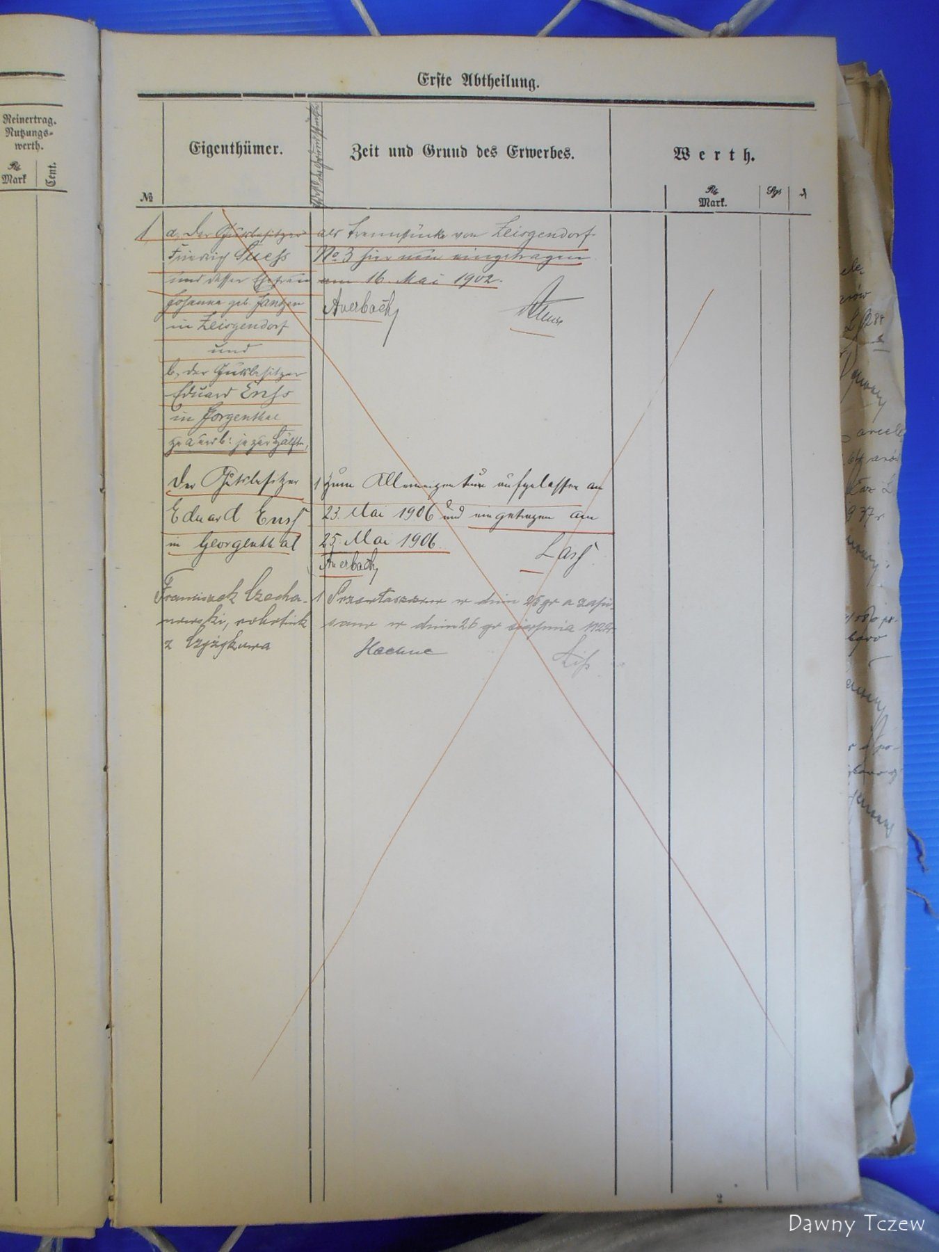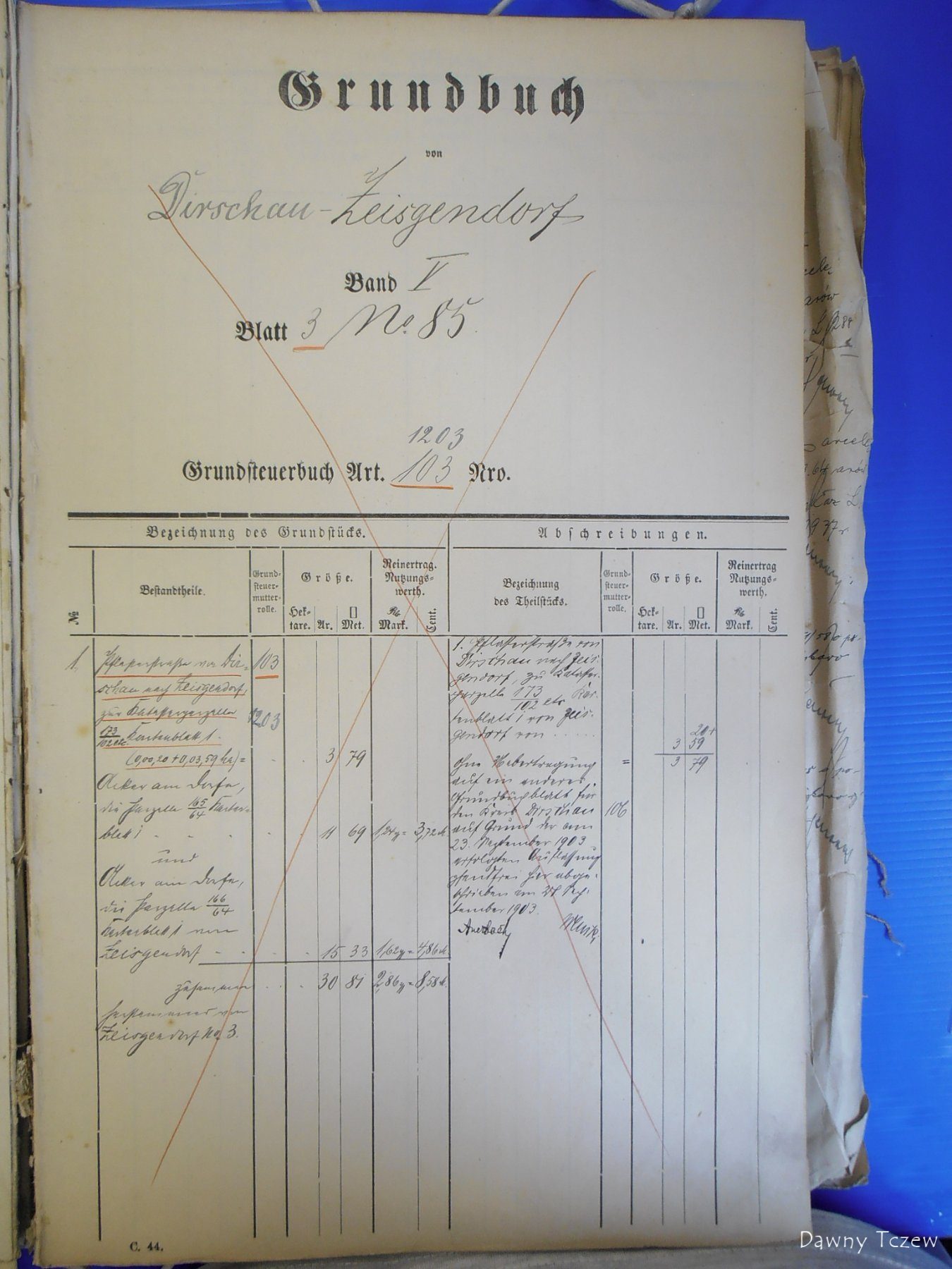 Tytułem ciekawostki - ta nieruchomość wywodzi się z dawnej zagrody gburskiej Zeisgendorf blatt 3, która w 2 poł. XIX w. należała do rodziny Schlesier, mającej siedzibę na Czyżykowskiej 77. W 1902 r. mason Alfred Schlesier sprzedał w równych częściach te ziemie Eduardowi Enssowi z Górek i Friedrichowi Suessowi od młyna czyżykowskiego na 30 Stycznia/Sportowej. 4 lata później Enss przejął całość. U progu II RP odkupił to wraz z całym majątkiem Górki i przyległościami Erich Preuss (brat Waltera z dworu Czyżykowo Polna 4), a od niego Stefan Łubieński. Franciszek nabył grunt w 1924 r., w ramach akcji osadniczej tej części posiadłości. Dwóch jego poprzedników nie ujęto w Grundbuchu. Jeszcze 5 lat temu, będąc w gdyńskim archiwum, sfotografowałem jednostkę "Sądu Obwodowego w Tczewie" o sygn. 103/10647 (Księga wieczysta Czyżykowo T.5, k.83-102, 1902-1992). Poniżej dwie strony odnoszące się dokładnie do tej posiadłości:
