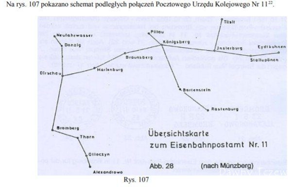 Na rys. 107 pokazano schemat podległych połączeń Pocztowego Urzędu Kolejowego
