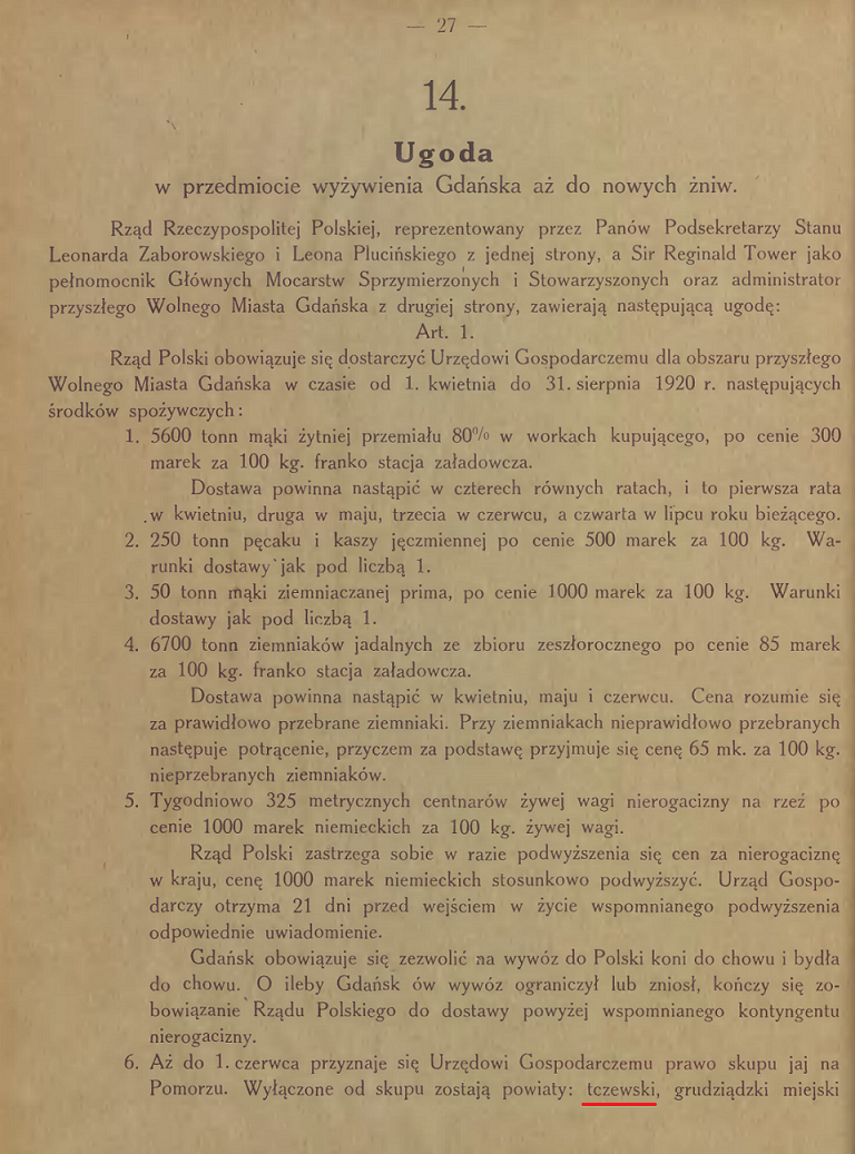 Aż do 1. czerwca przyznaje się Urzędowi Gospodarczemu prawo skupu jaj na Pomorzu. Wyłączone od skupu zostają powiaty: tczewski, grudziądzki miejski i wiejski, toruński miejski i wiejski. W tym celu winny być po bliższem porozumieniu czemprędzej utworzone składnice jaj w poszczególnych powiatach. Gdańsk płaci za jaja ceny targowe i powstające koszta.