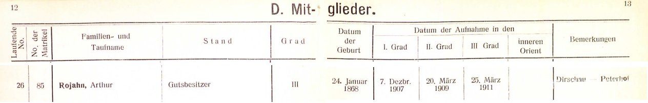W odniesieniu do Piotrowa daje to świetny efekt. Zabudowania folwarku są bardzo dobrze widoczne (w pobliżu też wiatrak), jednakże z karty ewidencji dóbr kultury nr 643 wynika, że dworek na Piotrowo 4 został wybudowany w 1906 r., zapewne w miejsce wcześniejszego budynku mieszkalnego właściciela majątku. Wiele wskazuje na to, że jego budowę zlecił Artur Rojahn, odnośnie którego wspomniano już we wcześniejszych postach, iż figuruje w rejestrze gospodarstw z lat 20. A tu wyciąg z "Mitglieder-Verzeichniss" 1913-14 odnośnie tego pana: