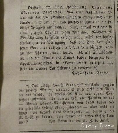Więcej o sprawie Mortary na którą powołuje się artykuł https://pl.wikipedia.org/wiki/Edgardo_MortaraDirschau, 22 marca. (Komunikat prywatny) Nowa historia Mortary. Około pięć lat temu miejscowa Żydówka urodziła nieślubnego chłopca i adoptowała go na religię żydowską według obrządku żydowskiego. Wkrótce potem pozwała miejscowego chrześcijanina o alimenty. Po rozpatrzeniu sprawy miejscowy sędzia wydał zarządzenie, że dziecko powinno zostać odebrane opiekunowi żydowskiemu i ochrzczone przez miejscowego proboszcza ewangelickiego. Ja, jako funkcjonariusz sekty, i matka dziecka protestowaliśmy przeciwko temu w Sądzie Apelacyjnym w Marienwerder i czekamy na dalszą decyzję.*)
