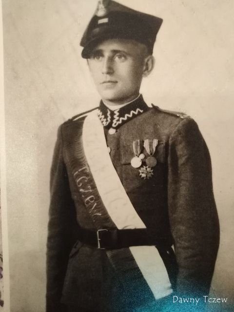 Rzeczywiście żołnierz na zdjęciu to Ferdynand Wojdyło urodzony 20.06.1913 r. w Olesnie. Mieszkał w Golubiu - Dobrzyniu i był kamieniarzem. W Tczewie miał brata Józefa i siostrę Zofię więc stąd jego wizyty w naszym mieście. Chętnie brał udział w zawodach sportowych i być może ta szarfa jest związana z jakimś udziałem w zawodach, ale tu pewności nie mam.