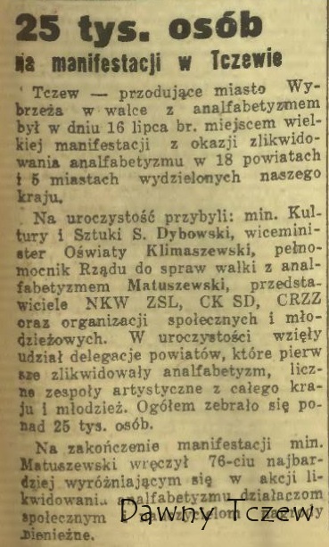 http://www.ksiaznicapodlaska.pl/site/bi ... p13_14.pdf Fragmenty z „Dziennika Bałtyckiego”: A tak z entuzjazmem opisało to wydarzenie „Życie Radomskie nr 197 z 19 lipca 1950 r” Oficjalnie (w propagandzie ) akcja zakończyła się wielkim sukcesem, natomiast w praktyce krótkie kursy nie zawsze przynosiły oczekiwane efekty. Jeszcze w latach 70. XX wieku, można było spotkać starsze osoby, które nie potrafiły się podpisać i na dokumentach stawiały krzyżyki .„ W niedzielę, dnia 16 lipca 1950 r. odbyło się pierwsze publiczne podsumowanie wyników walki z analfabetyzmem na ogólnopolskim zjeździe w Tczewie. Przybyli tam minister kultury i sztuki S. Dybowski, pełnomocnik rządu do spraw walki z analfabetyzmem S. Matuszewski, liczni przedstawiciele organizacji młodzieżowych i społecznych oraz wszyscy pełnomocnicy wojewódzcy, a także delegaci tych powiatów, które pierwsze wykonały swe zadania. Tczew był przodującym miastem Wybrzeża w walce z analfabetyzmem i z tego względu stał się miejscem 25. tys. manifestacji z okazji jego zlikwidowania. Ogółem w tym dniu meldunki o zakończeniu akcji likwidacji analfabetyzmu złożyło 18 powiatów, 5 miast, 79 miasteczek, 191 gmin, 3 991 gromad, 441 Państwowych Gospodarstw Rolnych, 177 spółdzielni produkcyjnych i 442 zakłady pracy. Na zakończenie manifestacji minister Matuszewski wręczył nagrody pieniężne 76 najbardziej wyróżniającym się w akcji zwalczania analfabetyzmu aktywistom i nauczycielom