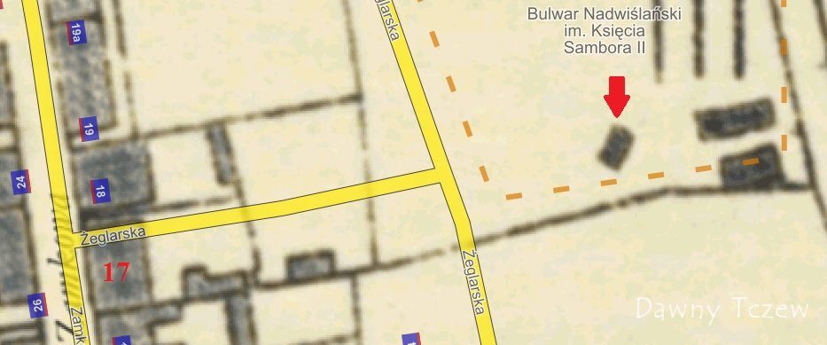 - Parcelę zajmowaną przez szeregowe budynki wielorodzinne na Zamkowej 20 (róg skrzyżowania z Żeglarską) odkupiło na pocz. XX w. miasto Tczew i powstała tam potem "Kuchnia Ubogich", co widać m.in. na planie z 1931 r.