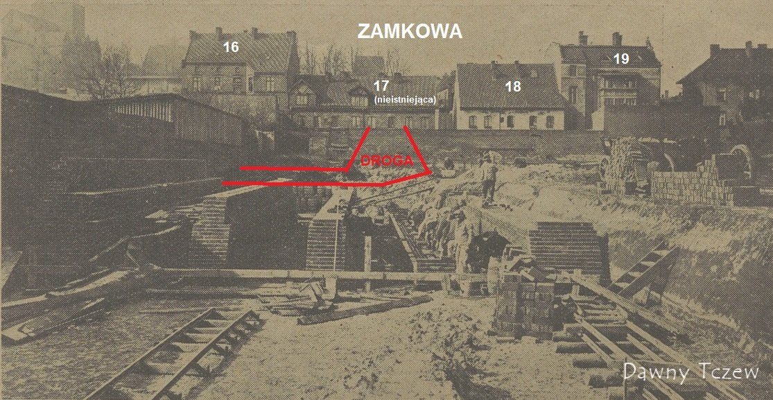Tych obiektów nie znajdziemy jeszcze ani na tej, ani innej pocztówce, przedstawiającej ulicę Zamkową, gdyż wykonane fotografie pochodzą z 1 dekady XX w. Wcześniej w tym miejscu znajdowały się zwykłe składowiska, co widać na fragmencie obu pocztówek z zasobów Skarbnicy Tczewskiej. Poniżej fragment jednej z nich: