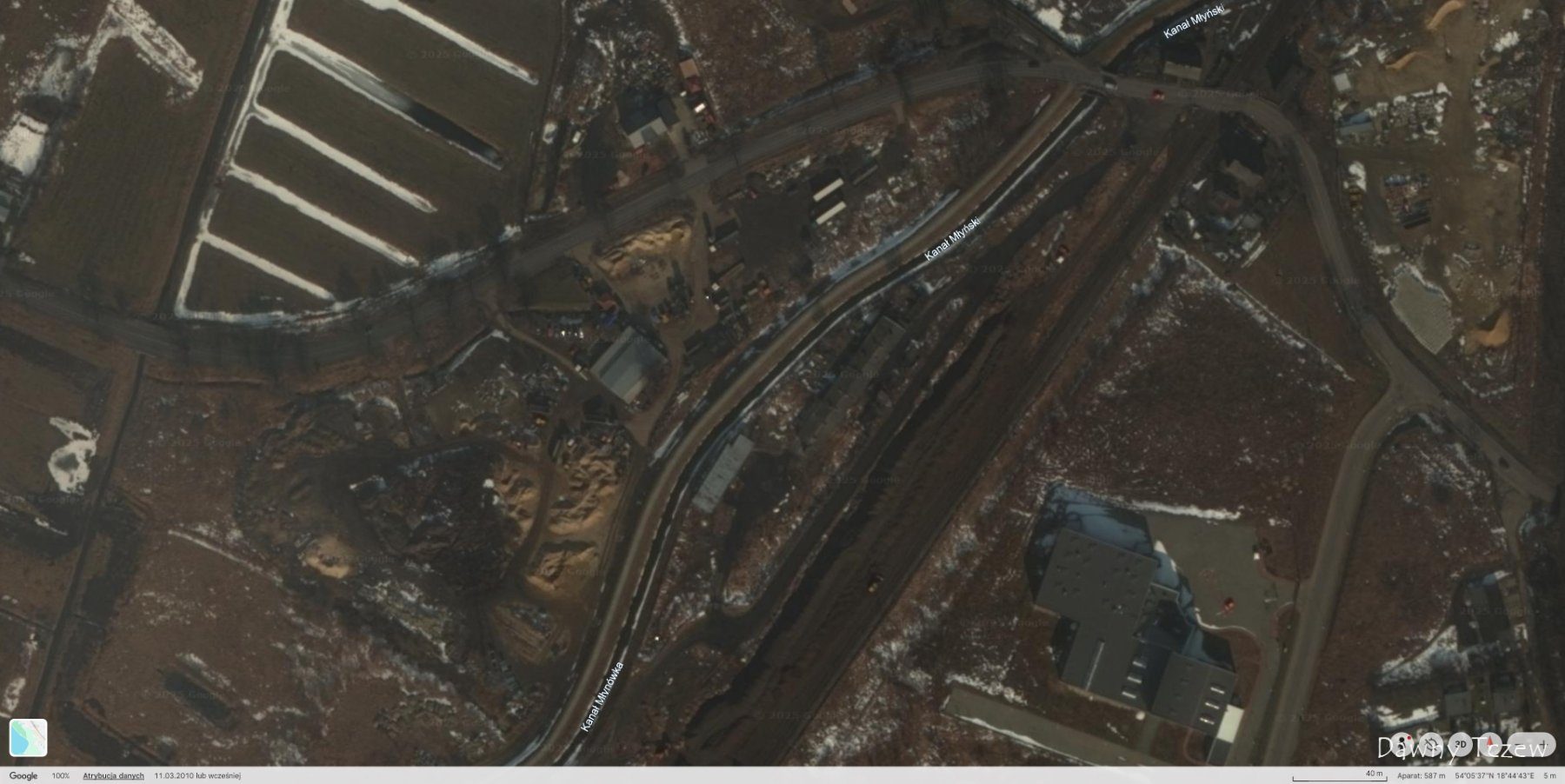 Widoczne "baraki" oraz tory na zdjęciu satelitarnym z dnia 11 marca roku 2010 w usłudze Google Earth:
