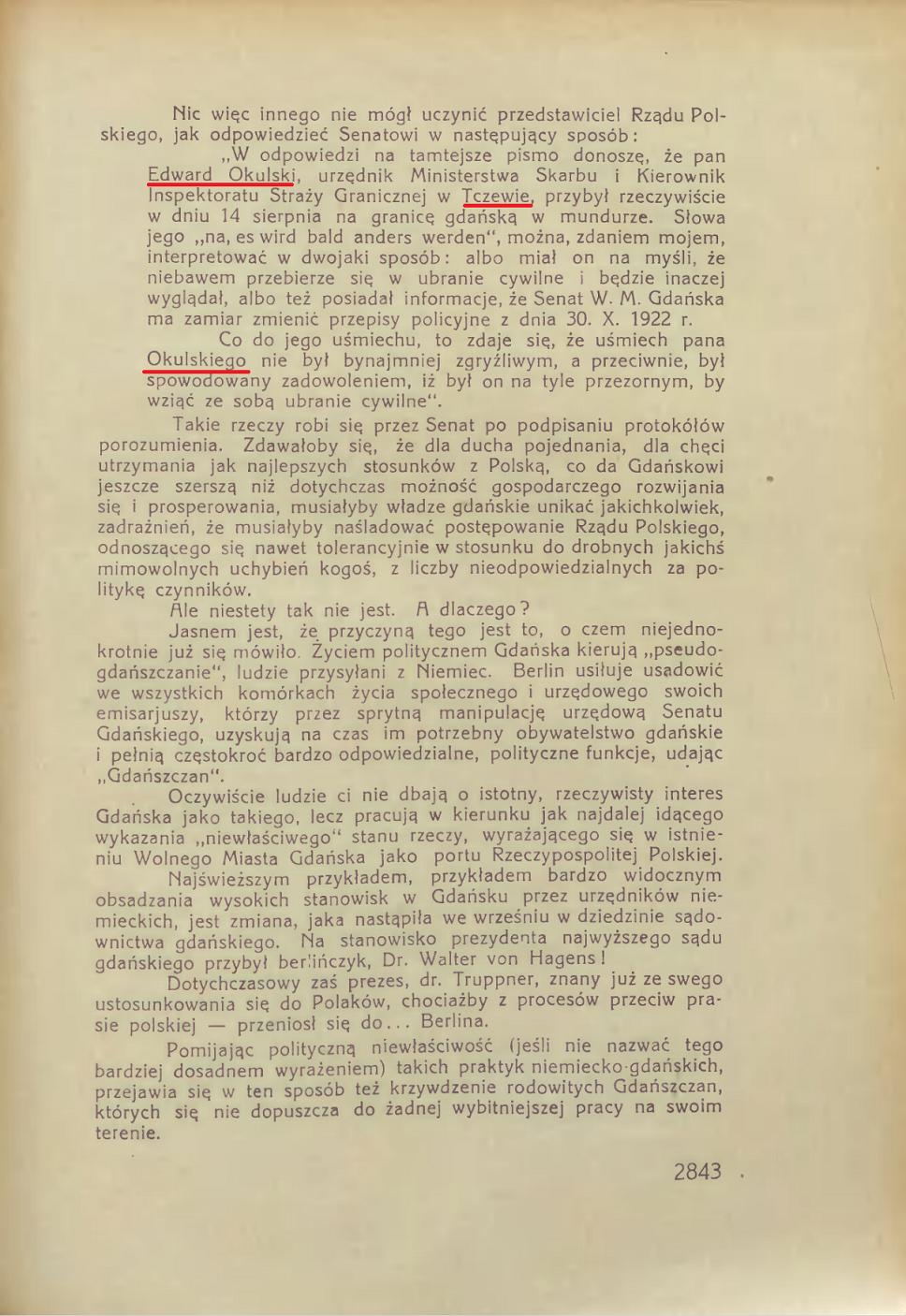 "W odpowiedzi na tamtejsze pismo donoszę, że pan Edward Okulski, urzędnik Ministerstwa Skarbu i Kierownik Inspektoratu Straży Granicznej w Tczewie, przybył rzeczywiście w dniu 14 sierpnia na granicę gdańską w mundurze. Słowa jego „na, es wird bald anders werden", można, zdaniem mojem, interpretować w dwojaki sposób: albo miał on na myśli, że niebawem przebierze się w ubranie cywilne i będzie inaczej wyglądał, albo też posiadał informacje, że Senat W. M. Gdańska ma zamiar zmienić: przepisy policyjne z dnia 30.X.1922 r.