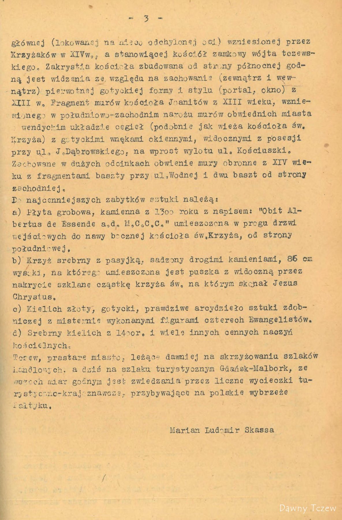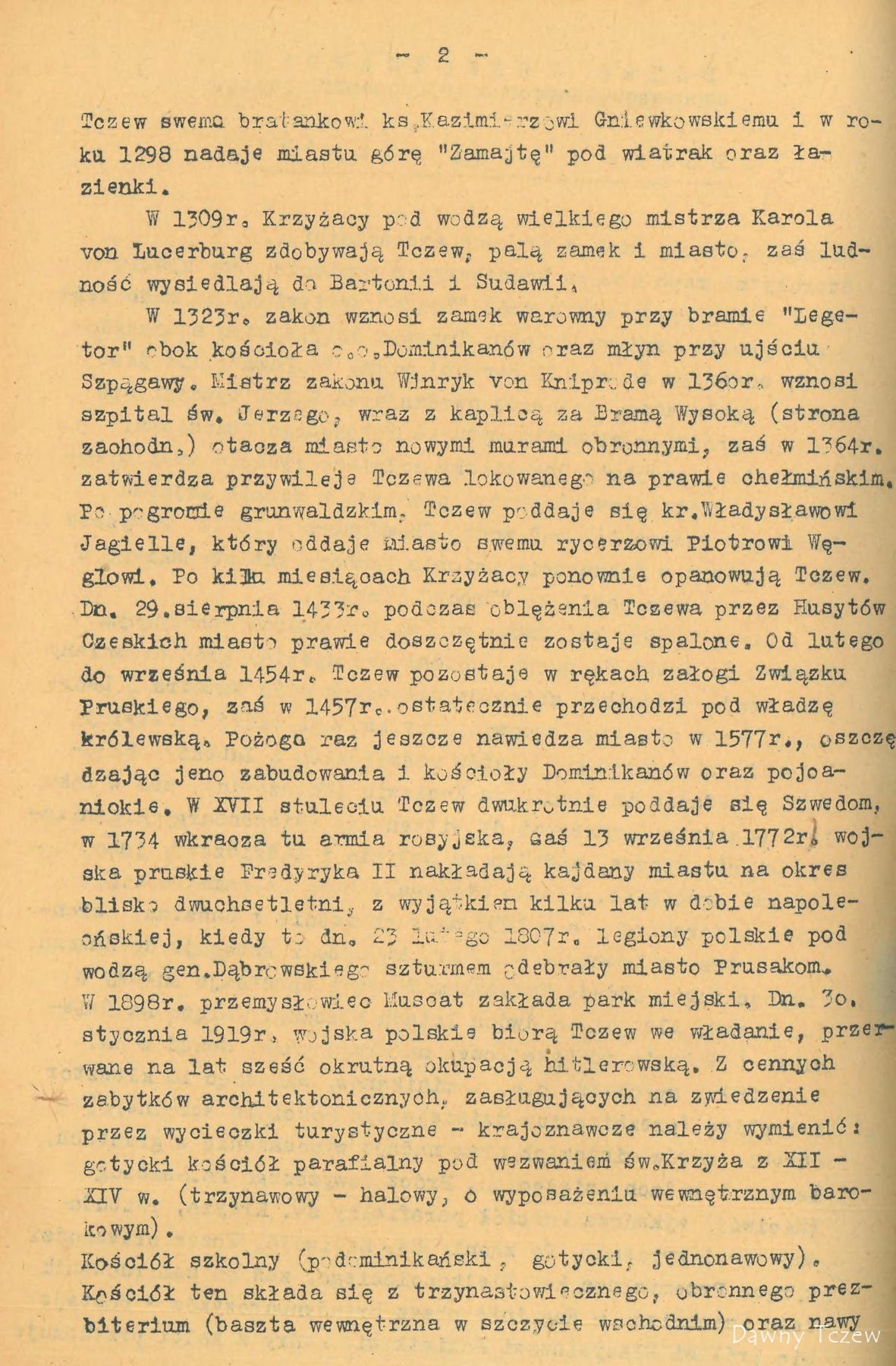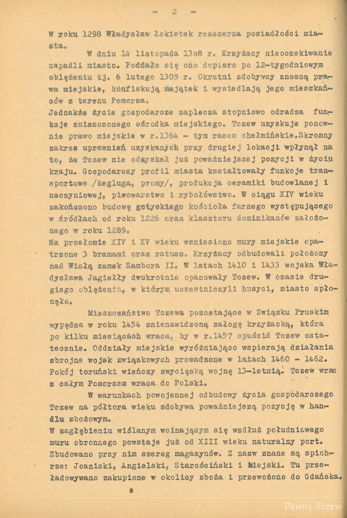 Najstarsza nazwa historyczna Tczewa brzmi Trsów. Uczony Mongrowiusz, lingwista, Niemiec, twierdzi, że oznaczało to miasto tkaczy i wprowadza pochodzenie słowa od czasownika ,, tkę, Tczesz ‘’. Niemiecki badacz L. Quandt w swych studiach bałtyckich podaje nazwy wielu dokumentów i to : 1198 r. Trsów , 1253 r. Trzewo , 1260r. Dersowe . Ostatnia nazwa figuruje w dokumencie łacińskim księcia Sambora II, nadającym Tczewowi prawa miasta w roku 1260 Ważne to sa dla nas świadectwa, bo niezbicie określające Tczew jako miejscowość polska , już w wieku XII. Od roku 1243 Tczew jest siedziba książąt pomorskich : Sambora II, Mestwina II i Kazimierza . W tym okresie nadeszła pierwsza nawałnica na Tczewa w postaci zakonu krzyżackiego . Oblegano miasto w roku 1308 . Pod murami jego krzyżaccy stawiają szubienice i grożą powieszeniem rajców, jeżeli będą zmuszeni miasto Tczew brać szturmem. Tczewianie nie zlękli się, poszli na walkę z Krzyżakami. W końcu, widząc ze wobec przemocy nie mogą się utrzymać, obywatele Tczewa podpalili miasto i zamek i zostawili wrogowi tylko rumowisko. Okrutna spotkała ich za to kara. Na rozkaz wielkiego mistrza Henryka V. Plotzke obywatele Tczewa zostali skazania banicję. Pozbawieni wszelkiego mienia , ale okryci nieśmiertelną sławą opuścili miasto. Nawet historycy niemieccy określali to postępowanie zakonu, jako okrutne i niezrozumiale. Krzyżacy wybudowali potem w Tczewie mocno obwarowany zamek i założyli komturię. Długo po klęsce pod Grunwaldem, bo dopiero w roku 1434, nadszedł na krzyżaków w Tczewie kres. Król polski wysłał pod Tczew Hussytow, specjalnie zaciętych wrogów krzyżactwa . Wycieli oni w pień zastępy Krzyżaków i spalili Tczew . Znowu zostało tylko pogorzelisko. Podczas wojen religijnych miasto zostało zburzone i zniszczone przez pożar prawie doszczętnie w roku 1577. Wielka kometa oświetlała wtedy koszmarne ruiny Tczewa. Tylko kościół św. Krzyża (fund.1226 r.) i klasztor dominikanów (fund. 1289 r.) Utrzymały się . Jednak drewniana końcówka wieży i spłaszczona forma dachu kościoła św. Krzyża świadczą do czasów obecnych o burzliwych przejściach Tczewa .Jeszcze raz spalił się Tczew podczas akcji wojennej Napoleona . Polskie legiony pod komenda generała Dąbrowskiego zdobyły Tczew dnia 23 lutego 1807 r. po wyparciu z niego Prusaków. Pięknie opisuje te dzieje polskiego żołnierza Stefan Żeromski w ,,Popiołach‘’. Ostatki ruin po komturii krzyżackiej rozebrali Prusacy w roku 1845 . Podczas wojny światowej w roku 1916 spalił się ratusz średniowieczny . Złośliwie może języki podawały , ze podsycono pożar naftą , żeby ogień był skuteczniejszy. Ratusz prowizoryczny do dzis znajduje się w b. szkole powszechnej. Ta mierna jako budynek szkoła powstała na miejscu pieknych krużganków klasztoru dominikanów w roku 1821 . Sam klasztor służył do 1853 ewangelikom jako kościół. 30 stycznia 1920 r. Tczew stał się miastem granicznym w Polsce odrodzonej. Obecnie na falisty terenie o poziomie do kilkudziesięciu metrów nad wodami Wisły , po lewym jej brzegu, rozciąga się miasto Tczew. Posiada duży węzeł kolejowy, osobowy i towarowy, ważny ze względu tranzytowych i strategicznych . Dwa potężne mosty przez Wisłę łączą miasto z lewym brzegiem. Tuż za mostem jest granica z wolnym miastem Gdańskiem . Z odległości 18 km patrzy na Tczew niemiecki Malborg. Linie kolejowe tranzytowe są : Berlin – Chojnice, Tczew, Malborg, Królewiec ,Ryga , Kowno. Druga linia Szczecin ,Wejherowo ,Gdynia, Gdańsk Tczew, Malborg Itp. Przez miasto Tczew prowadza dwie drogi kołowe tranzytowe. Ruch na tych odcinkach jest bardzo ożywiony ; ze względu na duży ruch Tczew musi postawić te drogi na poziomie europejskim . Główna linia kolejowa TCZEW –Laskowice –Bydgoszcz, łączy Tczew z cała Polska. Te liczne drogi kolejowe, przecinające miasto w rozmaitych kierunkach, są powodem, że rozwoju miasta jest utrudniony. W ostatnich latach budowano w Tczewie stosunkowo dużo, co jest widocznym znakiem pędu miasta do rozwoju. Dobry plan rozbudowy może dzielnice miasta odpowiednio powiązać i wprowadzić z biegiem lat w obraz całości – potrzebna harmonie . Jako osobliwe piękno architektoniczne zasługuje na uwagę stary most kołowy przez Wisłę z roku 1857 , który swoimi wieżycami nadaje Tczewowi szczególnego uroku . Formalnie TCZEW został uznany jako port morski już w roku 1928r. pierwszy raz w historii polskiej płynęły lichtugi morskie , obladowane węglem polskim z Tczewa przez Wisło ujście bezpośrednio do portów bałtyckich. Baza w Tczewie nie tylko ze względów handlowych ale i strategicznych odegrałby dla Polski role bardzo ważna . W uznaniu ważności Tczewa w zespole miast polskich władze nadzorcze przeniosły w roku 1936 TCZEW do wyższej kategorii t. j. do miast liczących ponad 25.000 mieszkańców choć miasto wtedy tej liczby ludności jeszcze nie osiągnęło. Miasto TCZEW spodziewa się przez to wydzielenia powiatu Tczewskiego . Stacja żeglugowa na Wiśle ma w lecie wielkie powodzenie. Dużo wycieczek z całej Polski kończy w Tczewie podróż koleją i jedzie stąd stadkami do Gdyni .Amatorzy wrażeń sportowych mogą spłynąć łódką rybacka , albo kajakiem aż do Wisłoujścia. W letni dzień. słoneczny panuje tam cudny nastrój ; widok połączenia Wisły z Bałtykiem jest tak piękny , że pozostawia niezapomniane wrażenie.
