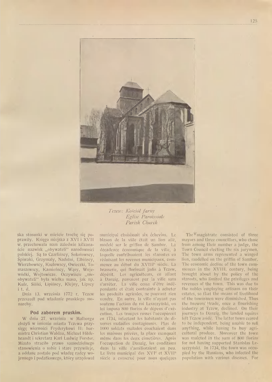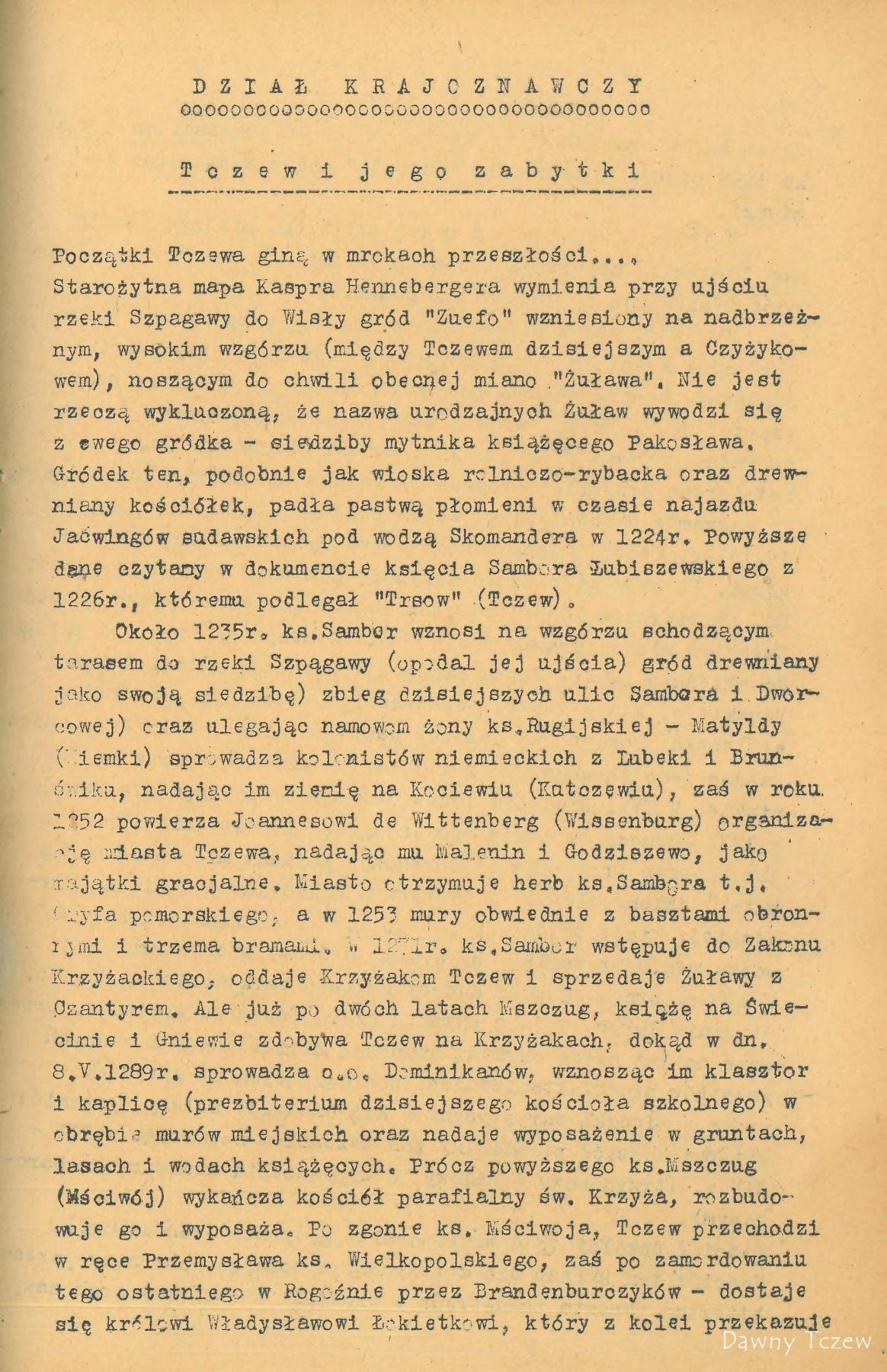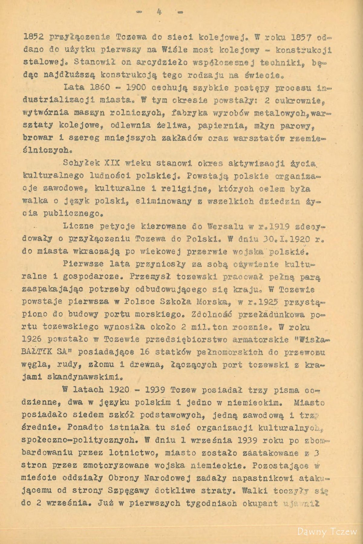 Najstarsza nazwa historyczna Tczewa brzmi Trsów. Uczony Mongrowiusz, lingwista, Niemiec, twierdzi, że oznaczało to miasto tkaczy i wprowadza pochodzenie słowa od czasownika ,, tkę, Tczesz ‘’. Niemiecki badacz L. Quandt w swych studiach bałtyckich podaje nazwy wielu dokumentów i to : 1198 r. Trsów , 1253 r. Trzewo , 1260r. Dersowe . Ostatnia nazwa figuruje w dokumencie łacińskim księcia Sambora II, nadającym Tczewowi prawa miasta w roku 1260 Ważne to sa dla nas świadectwa, bo niezbicie określające Tczew jako miejscowość polska , już w wieku XII. Od roku 1243 Tczew jest siedziba książąt pomorskich : Sambora II, Mestwina II i Kazimierza . W tym okresie nadeszła pierwsza nawałnica na Tczewa w postaci zakonu krzyżackiego . Oblegano miasto w roku 1308 . Pod murami jego krzyżaccy stawiają szubienice i grożą powieszeniem rajców, jeżeli będą zmuszeni miasto Tczew brać szturmem. Tczewianie nie zlękli się, poszli na walkę z Krzyżakami. W końcu, widząc ze wobec przemocy nie mogą się utrzymać, obywatele Tczewa podpalili miasto i zamek i zostawili wrogowi tylko rumowisko. Okrutna spotkała ich za to kara. Na rozkaz wielkiego mistrza Henryka V. Plotzke obywatele Tczewa zostali skazania banicję. Pozbawieni wszelkiego mienia , ale okryci nieśmiertelną sławą opuścili miasto. Nawet historycy niemieccy określali to postępowanie zakonu, jako okrutne i niezrozumiale. Krzyżacy wybudowali potem w Tczewie mocno obwarowany zamek i założyli komturię. Długo po klęsce pod Grunwaldem, bo dopiero w roku 1434, nadszedł na krzyżaków w Tczewie kres. Król polski wysłał pod Tczew Hussytow, specjalnie zaciętych wrogów krzyżactwa . Wycieli oni w pień zastępy Krzyżaków i spalili Tczew . Znowu zostało tylko pogorzelisko. Podczas wojen religijnych miasto zostało zburzone i zniszczone przez pożar prawie doszczętnie w roku 1577. Wielka kometa oświetlała wtedy koszmarne ruiny Tczewa. Tylko kościół św. Krzyża (fund.1226 r.) i klasztor dominikanów (fund. 1289 r.) Utrzymały się . Jednak drewniana końcówka wieży i spłaszczona forma dachu kościoła św. Krzyża świadczą do czasów obecnych o burzliwych przejściach Tczewa .Jeszcze raz spalił się Tczew podczas akcji wojennej Napoleona . Polskie legiony pod komenda generała Dąbrowskiego zdobyły Tczew dnia 23 lutego 1807 r. po wyparciu z niego Prusaków. Pięknie opisuje te dzieje polskiego żołnierza Stefan Żeromski w ,,Popiołach‘’. Ostatki ruin po komturii krzyżackiej rozebrali Prusacy w roku 1845 . Podczas wojny światowej w roku 1916 spalił się ratusz średniowieczny . Złośliwie może języki podawały , ze podsycono pożar naftą , żeby ogień był skuteczniejszy. Ratusz prowizoryczny do dzis znajduje się w b. szkole powszechnej. Ta mierna jako budynek szkoła powstała na miejscu pieknych krużganków klasztoru dominikanów w roku 1821 . Sam klasztor służył do 1853 ewangelikom jako kościół. 30 stycznia 1920 r. Tczew stał się miastem granicznym w Polsce odrodzonej. Obecnie na falisty terenie o poziomie do kilkudziesięciu metrów nad wodami Wisły , po lewym jej brzegu, rozciąga się miasto Tczew. Posiada duży węzeł kolejowy, osobowy i towarowy, ważny ze względu tranzytowych i strategicznych . Dwa potężne mosty przez Wisłę łączą miasto z lewym brzegiem. Tuż za mostem jest granica z wolnym miastem Gdańskiem . Z odległości 18 km patrzy na Tczew niemiecki Malborg. Linie kolejowe tranzytowe są : Berlin – Chojnice, Tczew, Malborg, Królewiec ,Ryga , Kowno. Druga linia Szczecin ,Wejherowo ,Gdynia, Gdańsk Tczew, Malborg Itp. Przez miasto Tczew prowadza dwie drogi kołowe tranzytowe. Ruch na tych odcinkach jest bardzo ożywiony ; ze względu na duży ruch Tczew musi postawić te drogi na poziomie europejskim . Główna linia kolejowa TCZEW –Laskowice –Bydgoszcz, łączy Tczew z cała Polska. Te liczne drogi kolejowe, przecinające miasto w rozmaitych kierunkach, są powodem, że rozwoju miasta jest utrudniony. W ostatnich latach budowano w Tczewie stosunkowo dużo, co jest widocznym znakiem pędu miasta do rozwoju. Dobry plan rozbudowy może dzielnice miasta odpowiednio powiązać i wprowadzić z biegiem lat w obraz całości – potrzebna harmonie . Jako osobliwe piękno architektoniczne zasługuje na uwagę stary most kołowy przez Wisłę z roku 1857 , który swoimi wieżycami nadaje Tczewowi szczególnego uroku . Formalnie TCZEW został uznany jako port morski już w roku 1928r. pierwszy raz w historii polskiej płynęły lichtugi morskie , obladowane węglem polskim z Tczewa przez Wisło ujście bezpośrednio do portów bałtyckich. Baza w Tczewie nie tylko ze względów handlowych ale i strategicznych odegrałby dla Polski role bardzo ważna . W uznaniu ważności Tczewa w zespole miast polskich władze nadzorcze przeniosły w roku 1936 TCZEW do wyższej kategorii t. j. do miast liczących ponad 25.000 mieszkańców choć miasto wtedy tej liczby ludności jeszcze nie osiągnęło. Miasto TCZEW spodziewa się przez to wydzielenia powiatu Tczewskiego . Stacja żeglugowa na Wiśle ma w lecie wielkie powodzenie. Dużo wycieczek z całej Polski kończy w Tczewie podróż koleją i jedzie stąd stadkami do Gdyni .Amatorzy wrażeń sportowych mogą spłynąć łódką rybacka , albo kajakiem aż do Wisłoujścia. W letni dzień. słoneczny panuje tam cudny nastrój ; widok połączenia Wisły z Bałtykiem jest tak piękny , że pozostawia niezapomniane wrażenie.