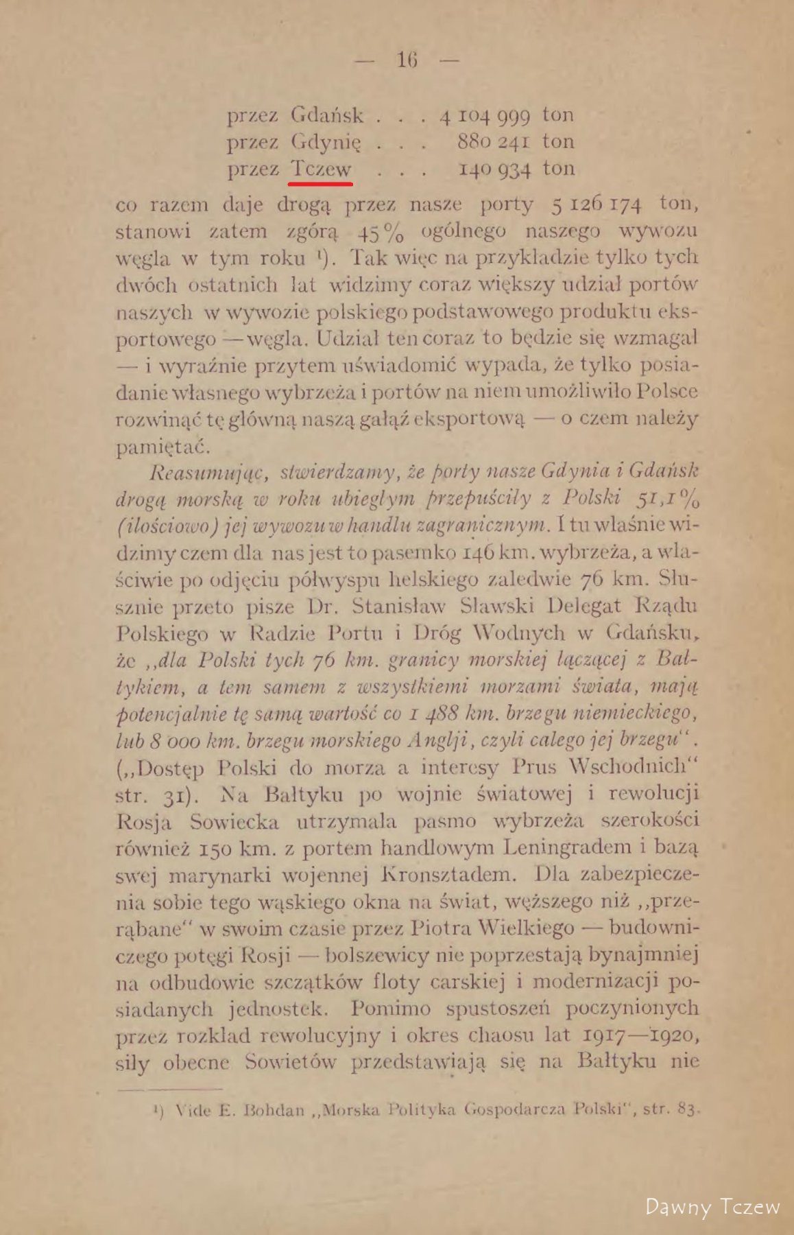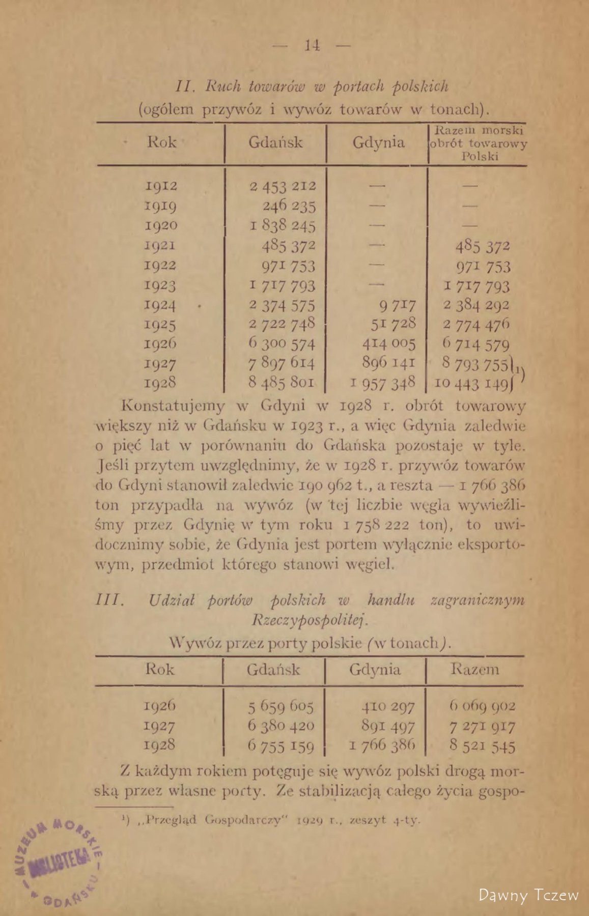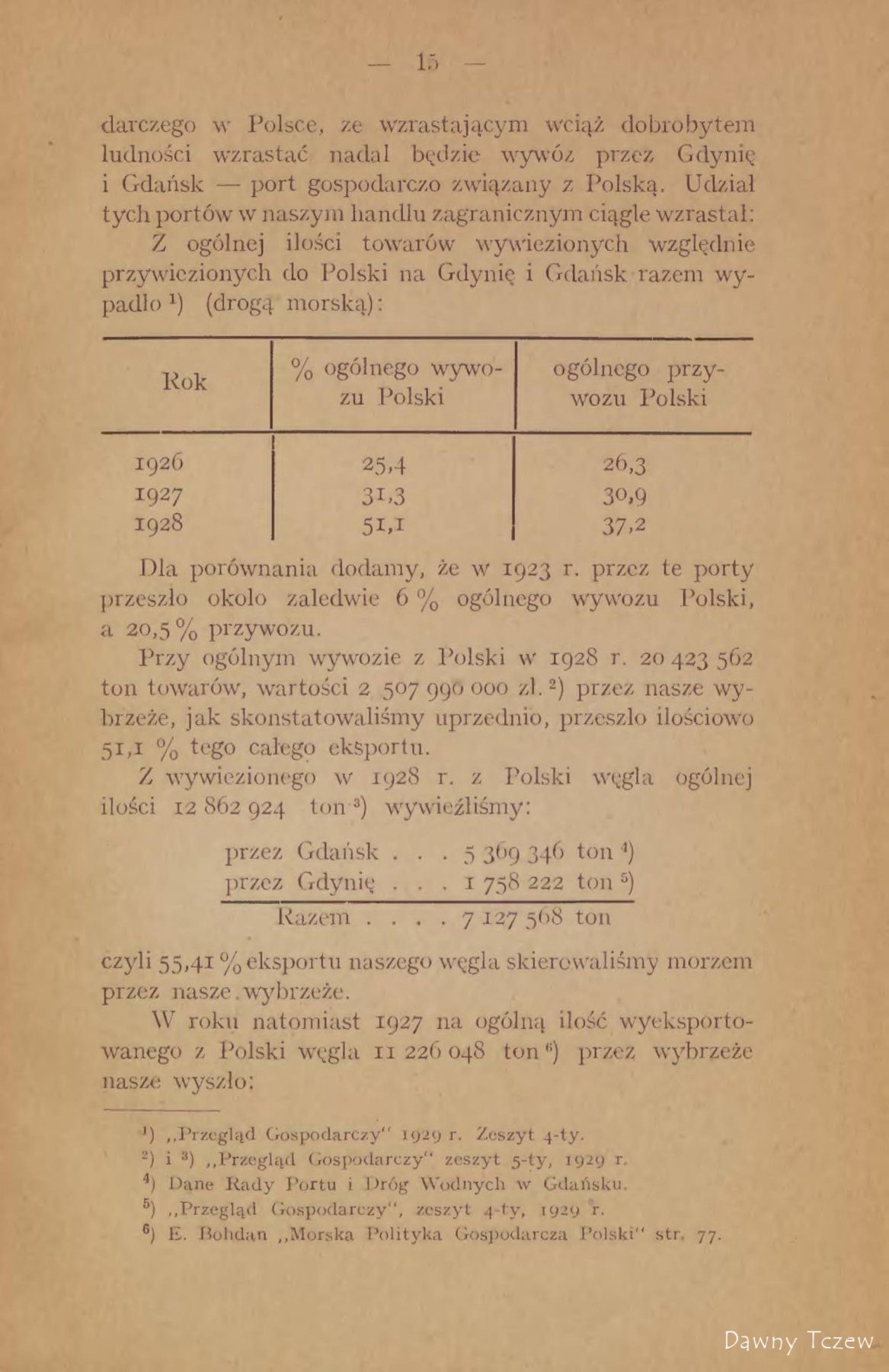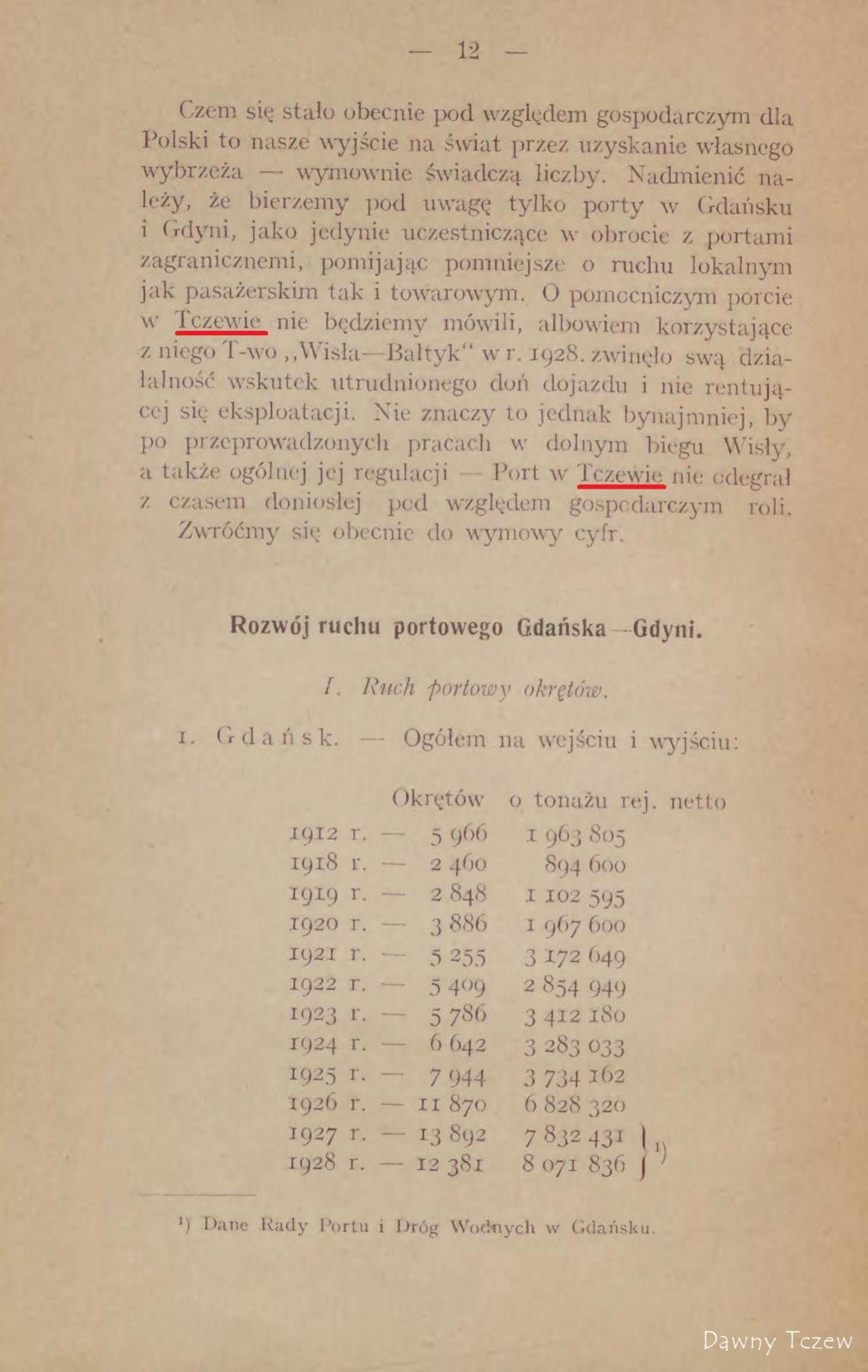 Czem się stało obecnie pod względem gospodarczym dla Polski to nasze wyjście na świat przez uzyskanie własnego wybrzeża — wymownie świadczą liczby. Nadmienić należy, że bierzemy pod uwagę tylko porty w Gdańsku i Gdyni, jako jedynie uczestniczące w obrocie z portami zagranicznemi, pomijając pomniejsze o ruchu lokalnym jak pasażerskim tak i towarowym. O pomocniczym porcie w Tczewie nie będziemy mówili, albowiem korzystające z niego T-wo "Wisła—Bałtyk" w r. 1928 zwinęło swą działalność wskutek utrudnionego doń dojazdu i nie rentującej się eksploatacji. Nie znaczy to jednak bynajmniej, by po przeprowadzonych pracach w dolnym biegu Wisły, a także ogólnej jej regulacji — Port w Tczewie nie odegrał z czasem doniosłej pod względem gospodarczym roli.
