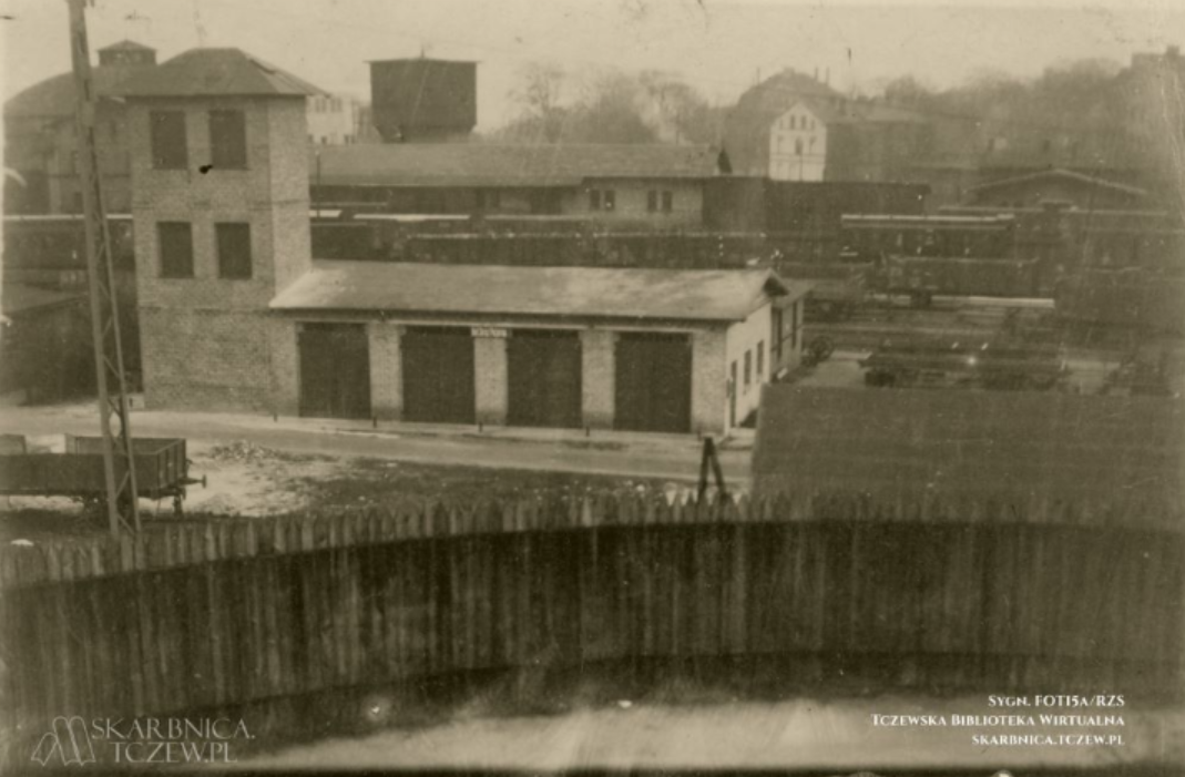 Tczew. Kolejowa Ochotnicza Straż Pożarna w Tczewie. W kadrze widoczny fragment strażnicy przy obecnej ulicy Lecha 11. Lata 50. XX wieku