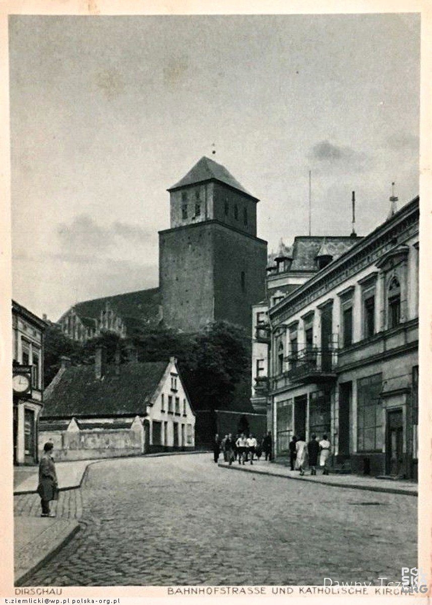 Ciekawe ujęcie ulicy Wyszyńskiego, na którym widać kamienice po drugiej stronie zegara.