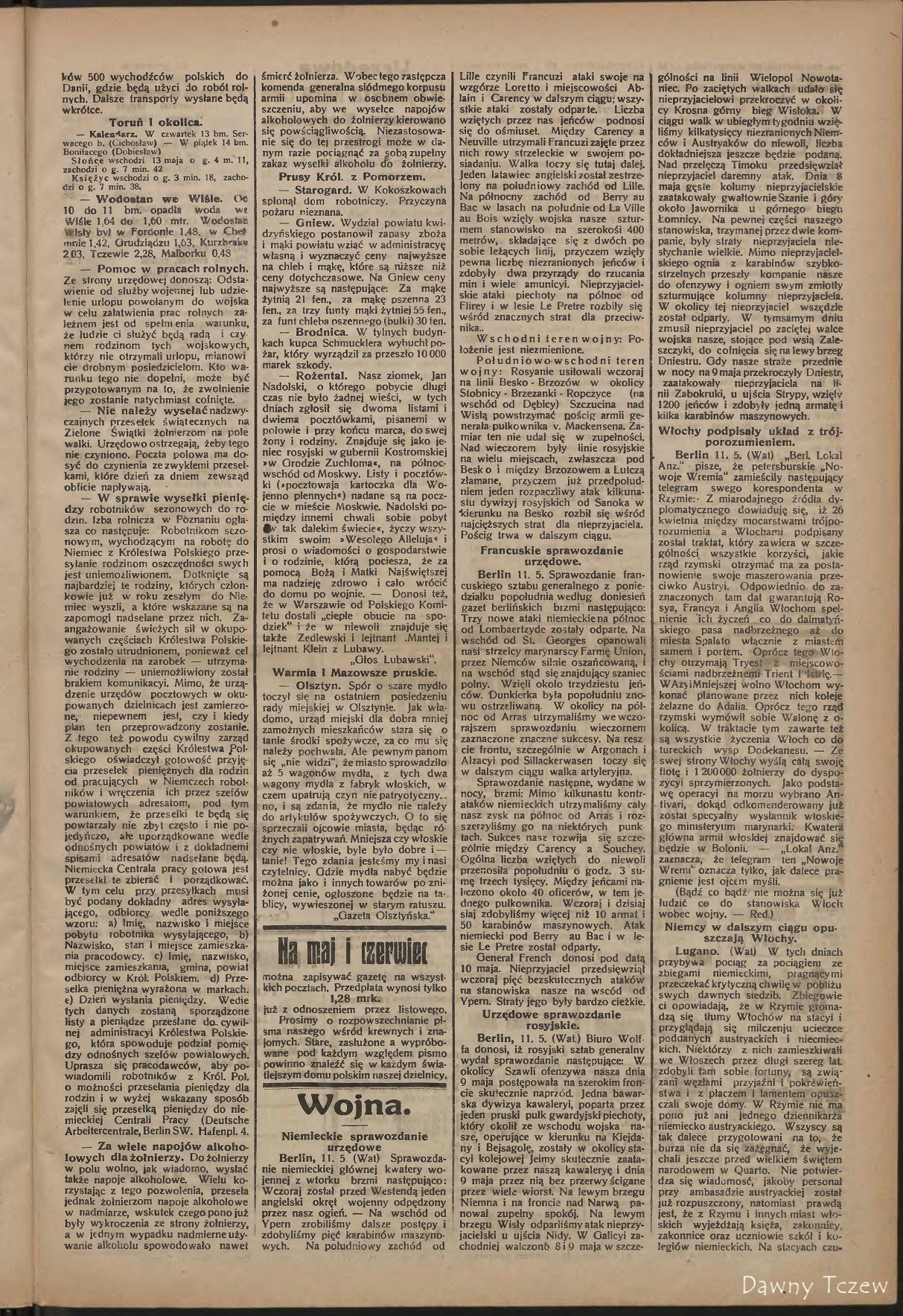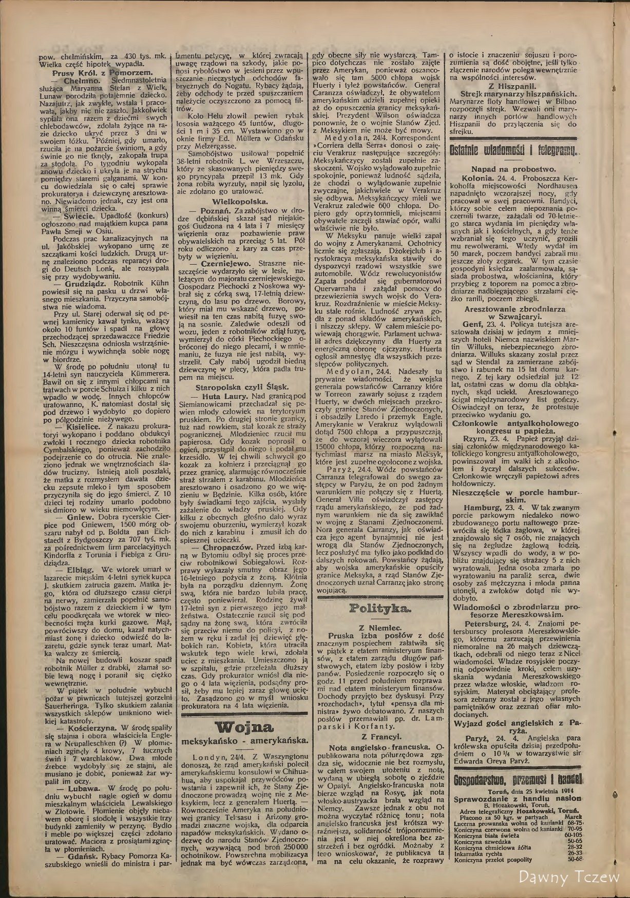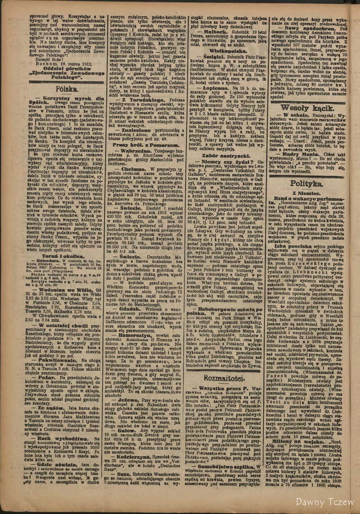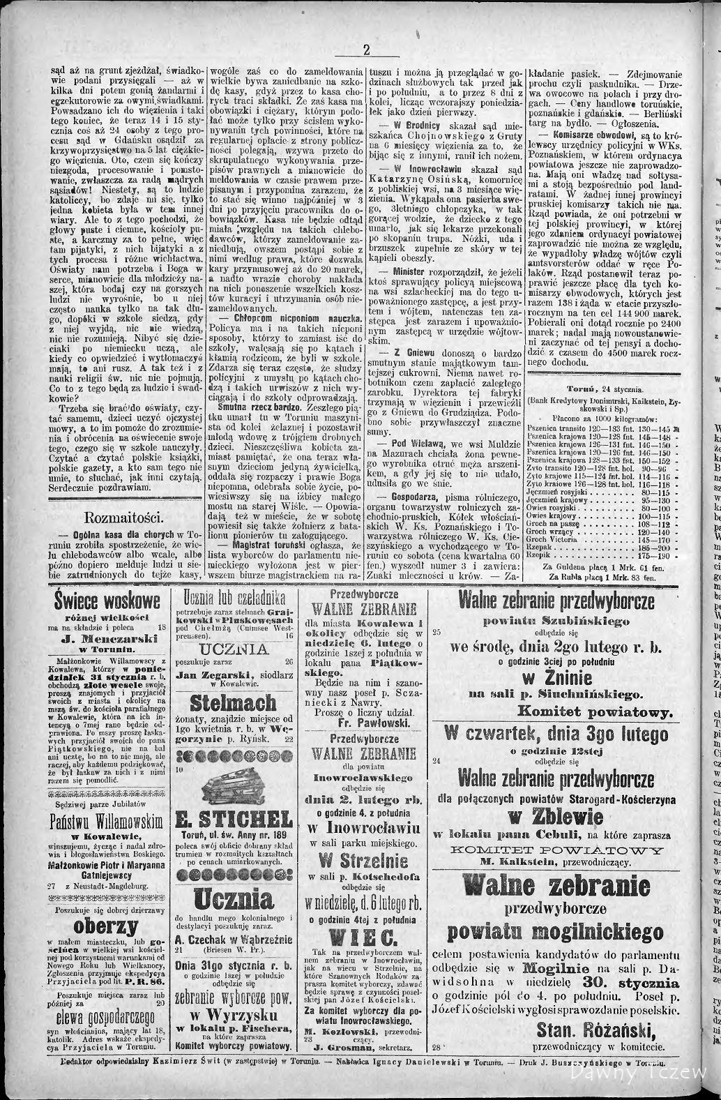 - Kilku kupc6w z Gniewu, Nowego i Kwidzyna poniosło znaczne straty przez to, że przeznaczona dla nich berlinka, naładowana solą, zatonęła na Wiśle pod Czerwoną budą. Aby przynajmniej coś uratować, wystosował jeden z poszkodzonych kupców, przeszedłszy wszystkie instancye, prośbę do cesarza Wilhelma o zwrot zapłaconej akcyzy, lecz ministeryum finansów nie uwzględniło tej prośby. Słychać, że sprawa ta przyjdzie jeszcze przed sejm, gdyż swojego czasu minister finansów Hobrecht w podobnym przypadku miał zadecydować na korzyść petentów.