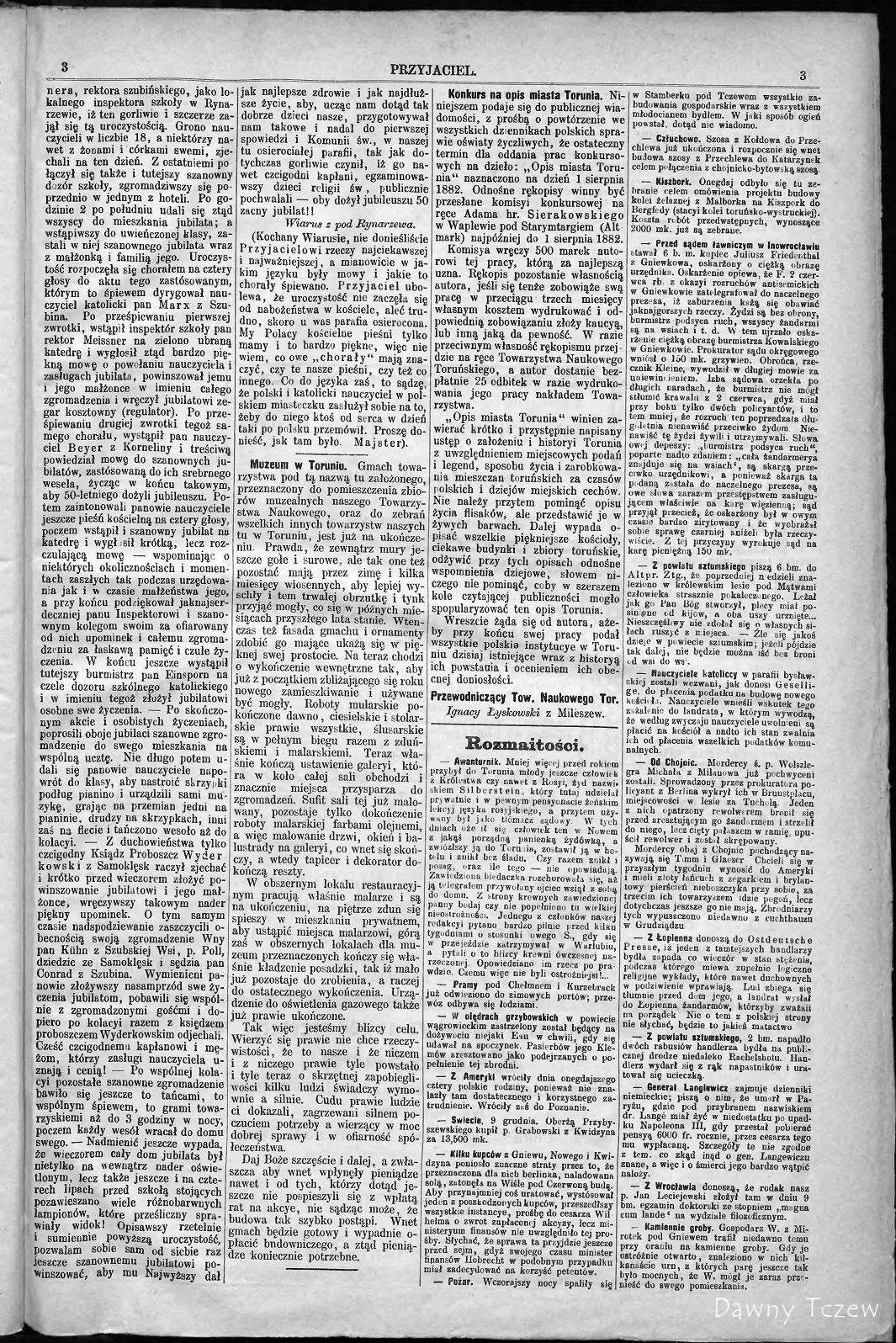 - W Grudziądzu sądził w drugiej instancyi sąd ziemiański następującą sprawę. Pewien katolik z Gniewu pożyczył od sąsiada ewangelika biblii i wydarł z niej 12 kart przedmowy, wymyślającej na papiestwo. Zaskarżony o uszkodzenie całej własności, skazany został w Gniewie przez sąd ławniczy na 14 dni więzienia. Apelacya złagodziła wyrok na 50 m. Dziwny przytem zbieg osób, ten: który karty wydarł, był dawniej protestantem i nawrócił się na katolicyzm, pożyczający przeciwnie z katolika protestant, sędzia okręgowy zaś żyd.