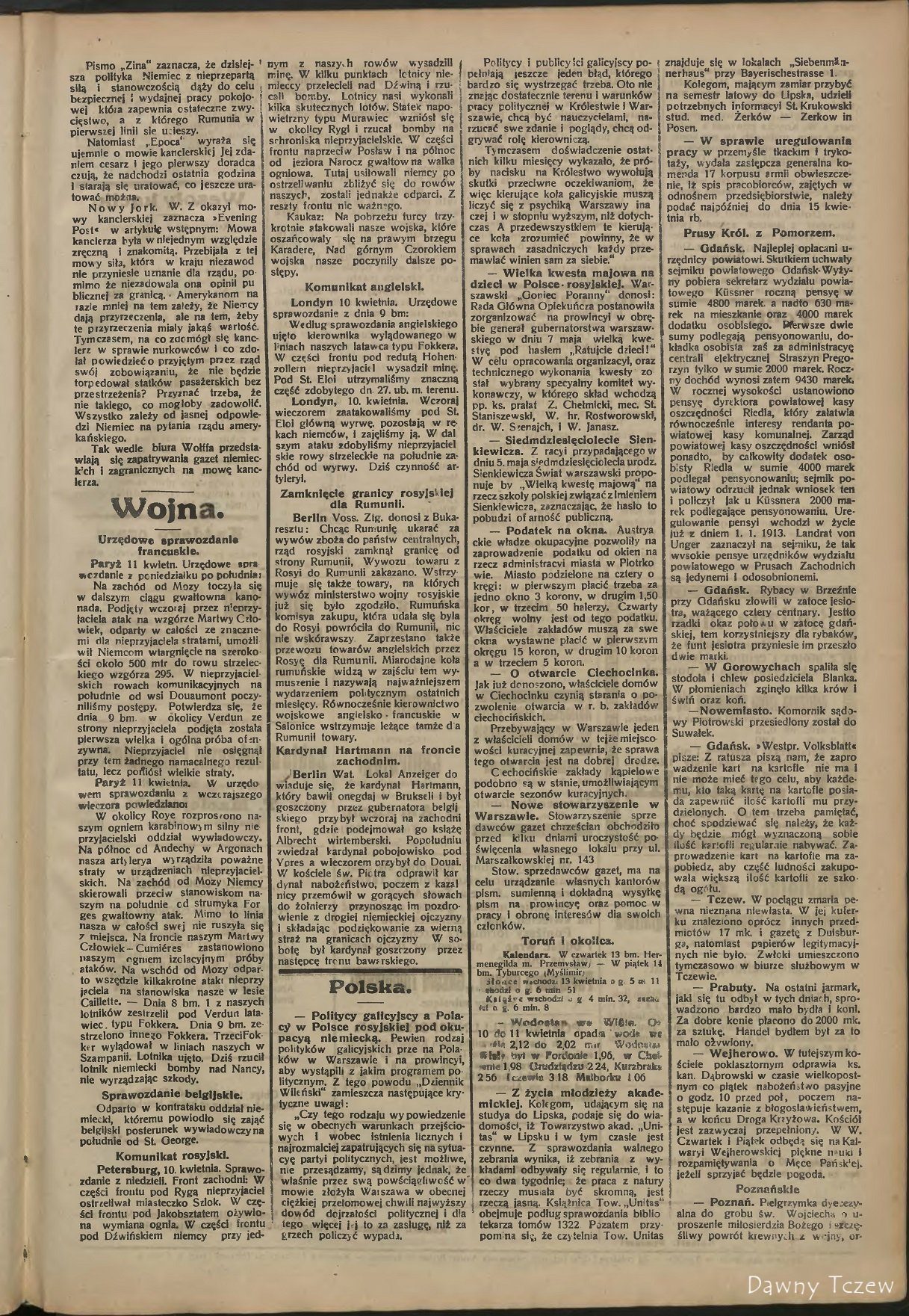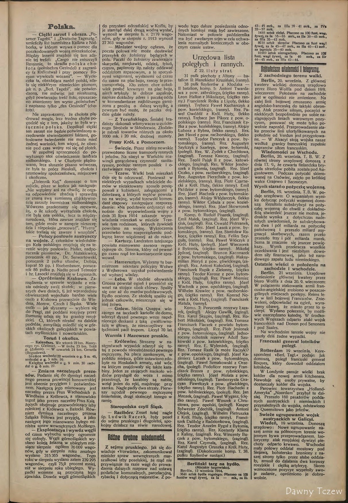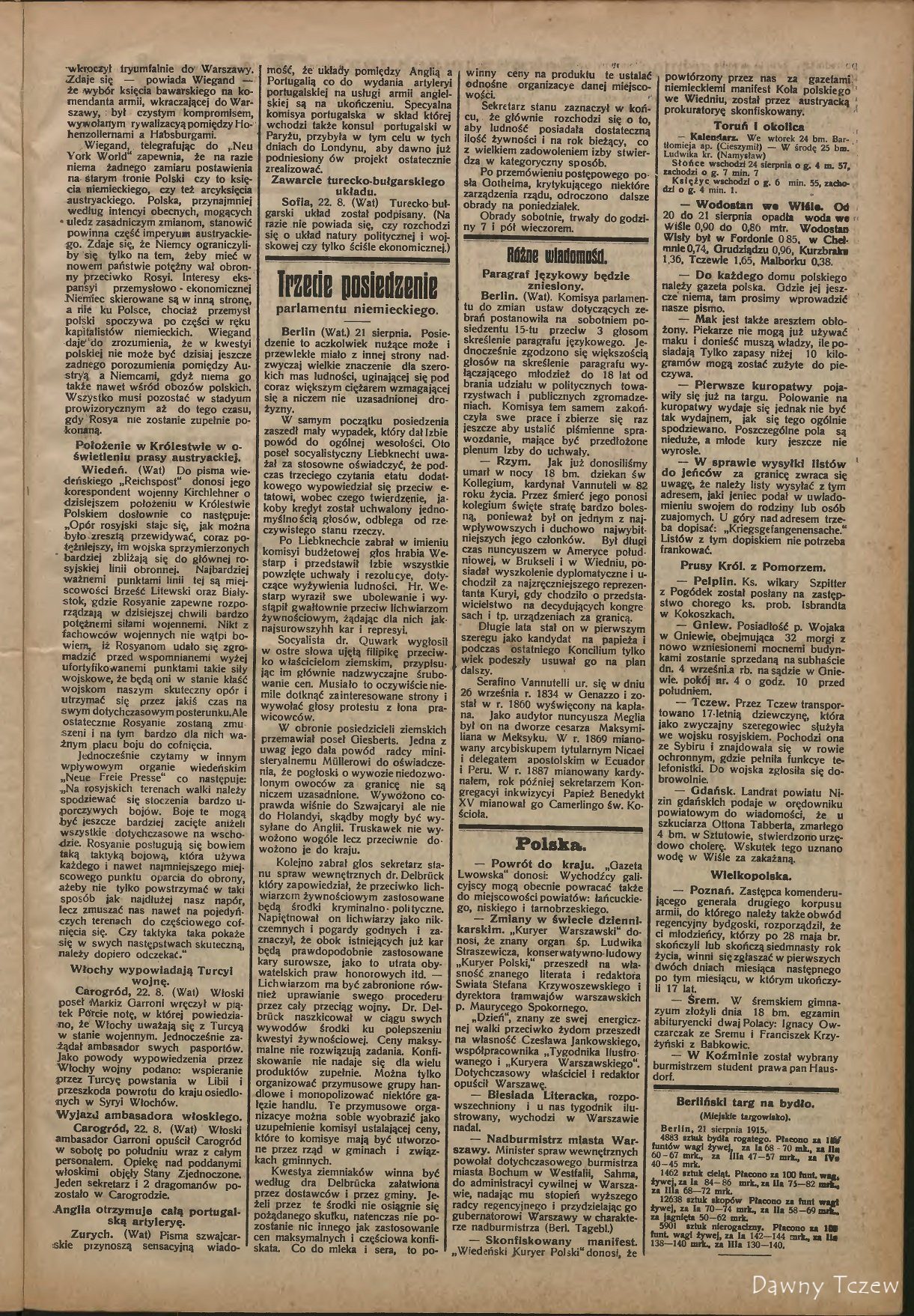 — Tczew. Wielki brak mieszkań daje się tu odczuwać. Ponieważ w niektórych wypadkach właściciele domów w nietaktowany sposób postępowali z kobietami, zalegającemi z dzierżawą, a których mężów powołano na wojnę, wydał tczewski komendant etapowy następujące rozporządzenie: "Na podstawie ordynacyi odnośnie do wypowiedzenia wojny z dnia 31 lipca 1914 zakazuje wypowiadania mieszkań w mieście Tczewie tym rodzinom, których żywicieli powołano na wojnę. Wykroczenia przeciwko temu rozporządzeniu podlegają karze więziennej aż do roku".