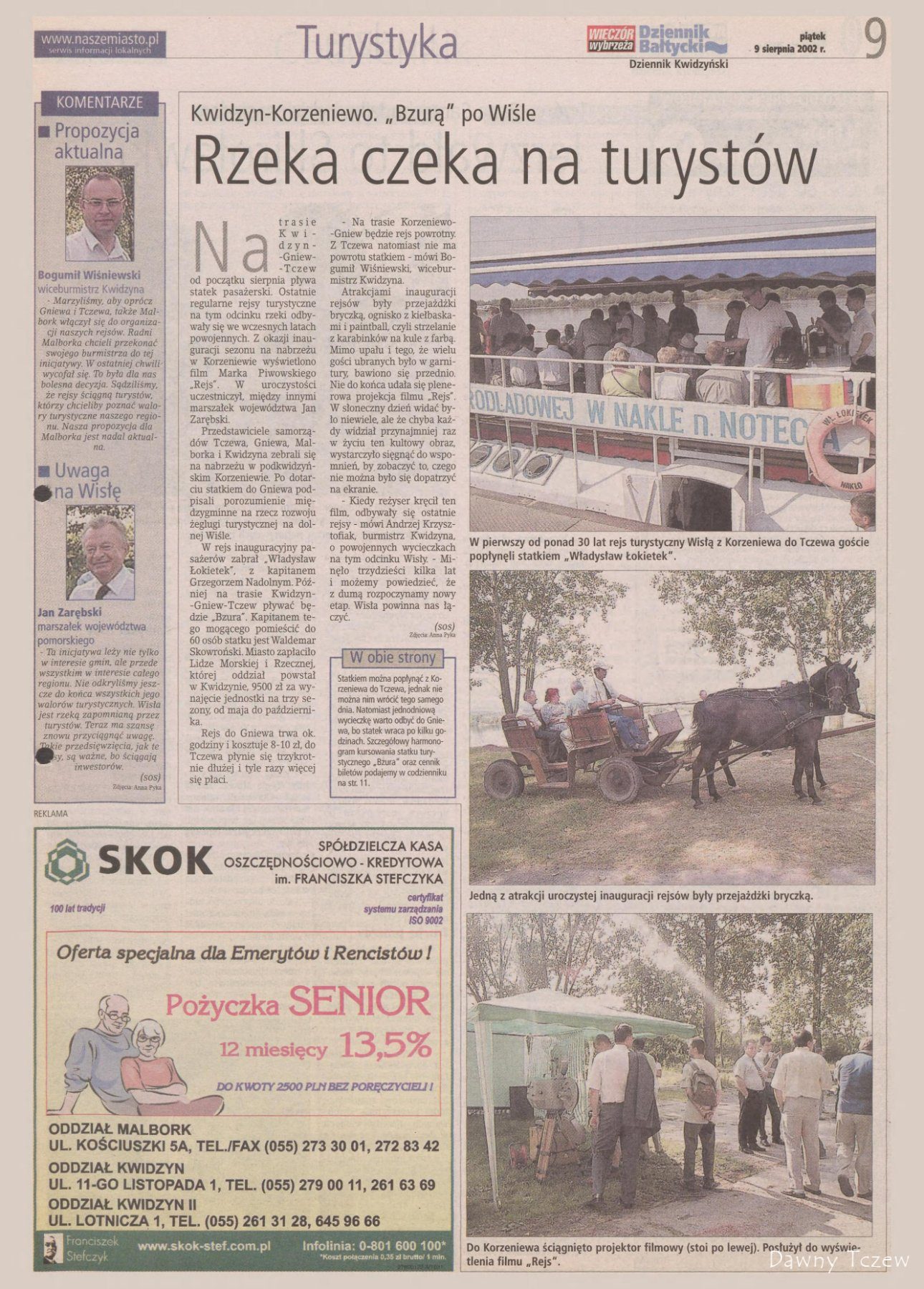 W rejs inauguracyjny pasażerów zabrał „Władysław Łokietek", z kapitanem Grzegorzem Nadolnym. Później na trasie Kwidzyn--Gniew-Tczew pływać będzie „Bzura". Kapitanem tego mogącego pomieścić do 60 osób statku jest Waldemar Skowroński. Miasto zapłaciło Lidze Morskiej i Rzecznej,