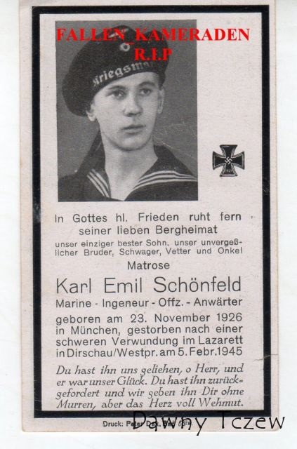 Marine-Artillerist Emil Karl Schönfeld – 05.02.1945 – spoczywa na cmentarzu w m. Stare Czarnowo, Block 18 Reiche 3 Grab 104