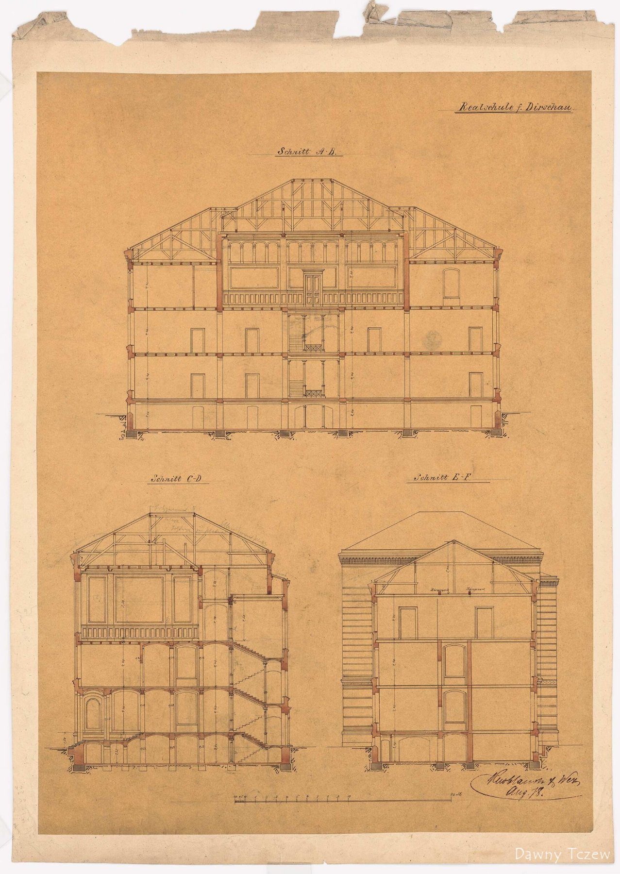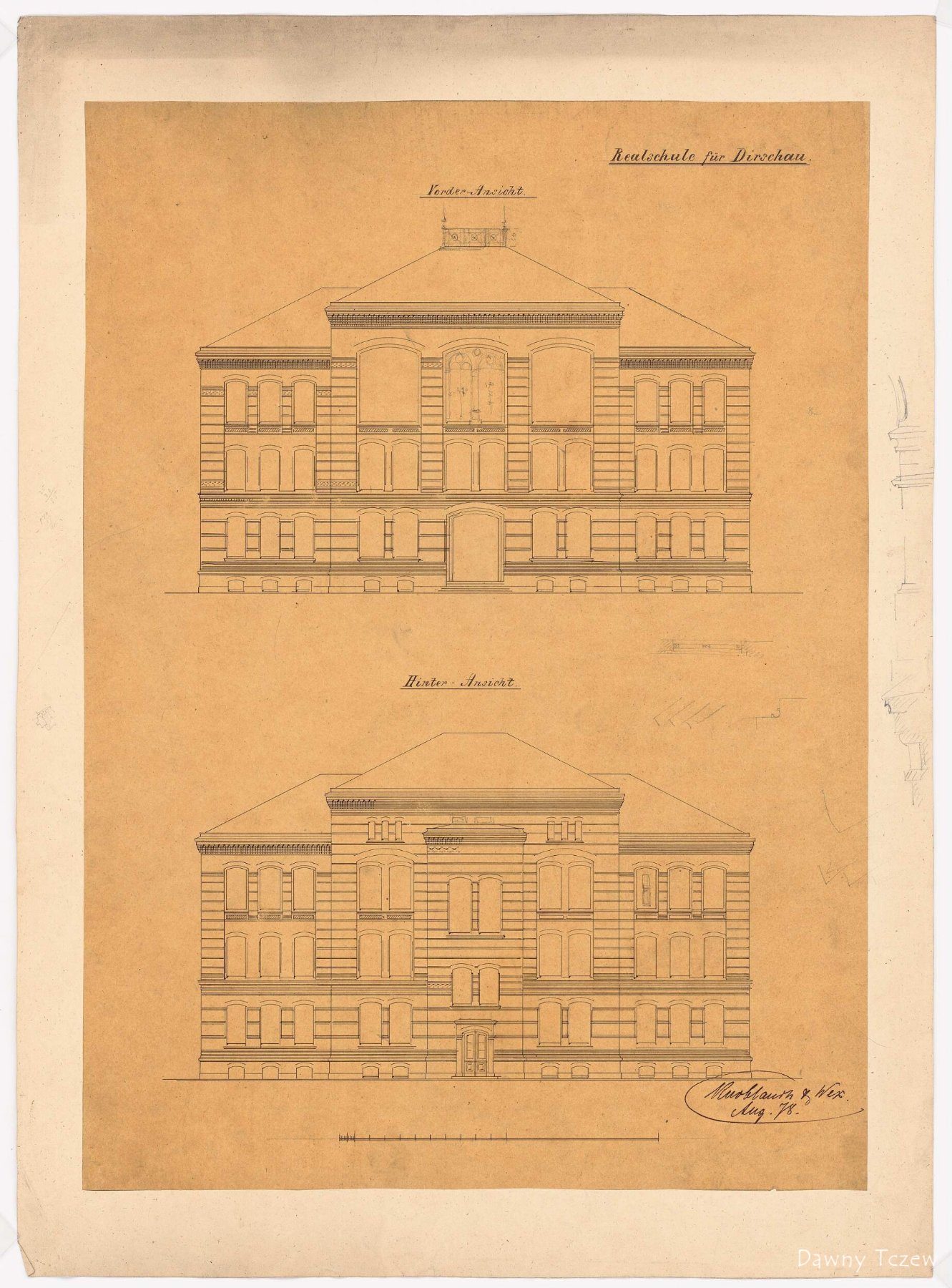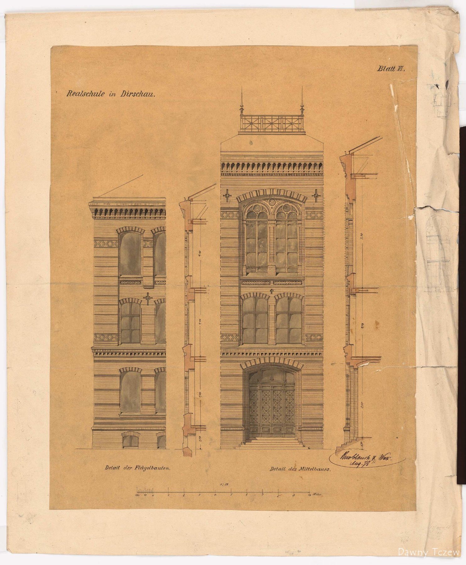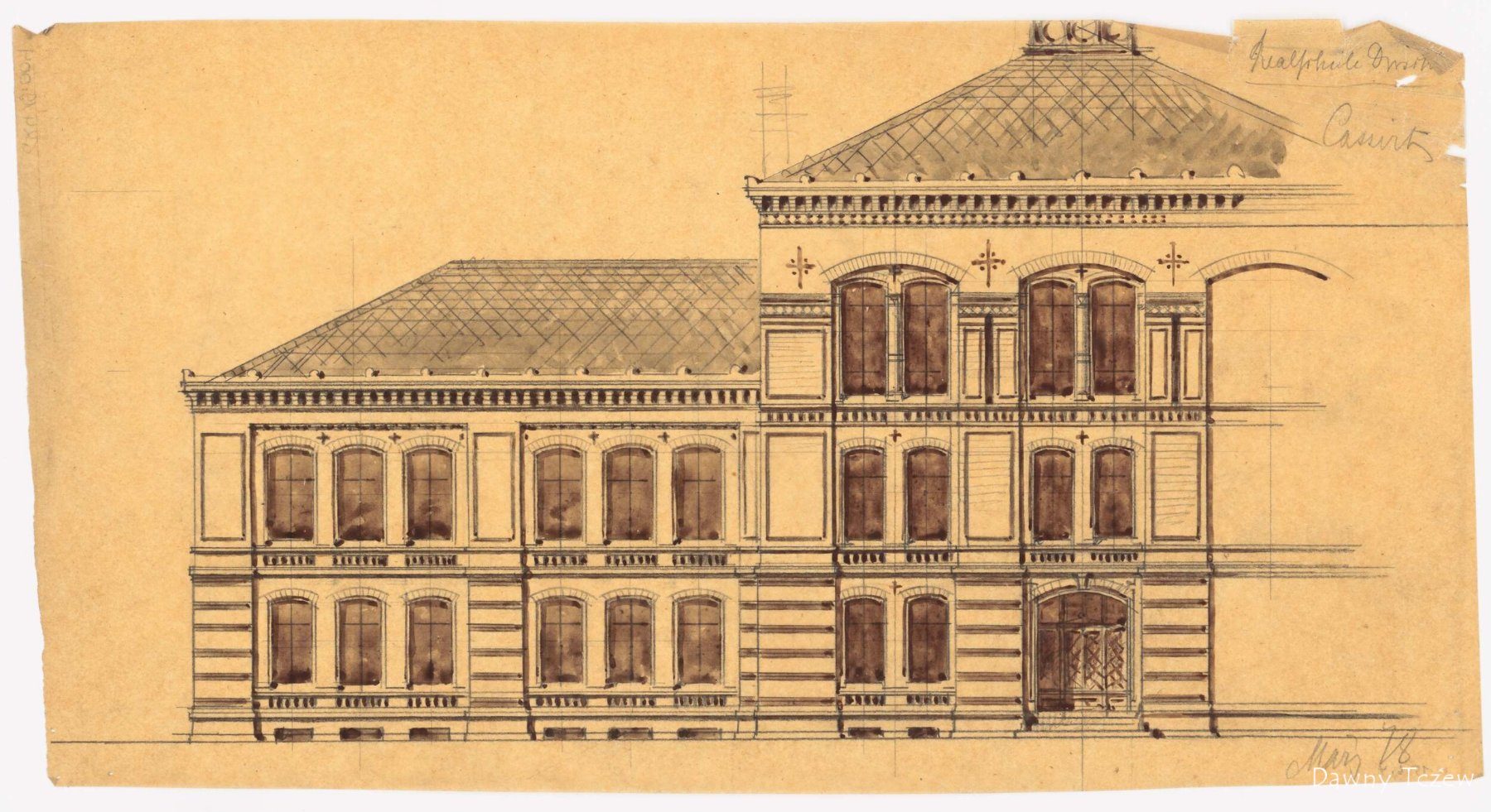 Zacznę od tego, że zabrakło komentarza lub go przeoczyłem, że to była nieostateczna wersja projektu (głównie lewa strona chyba nie powstała nigdy w tej formie (szerokość, liczba pięter, liczba okien)) na tym jednym rysunku:
