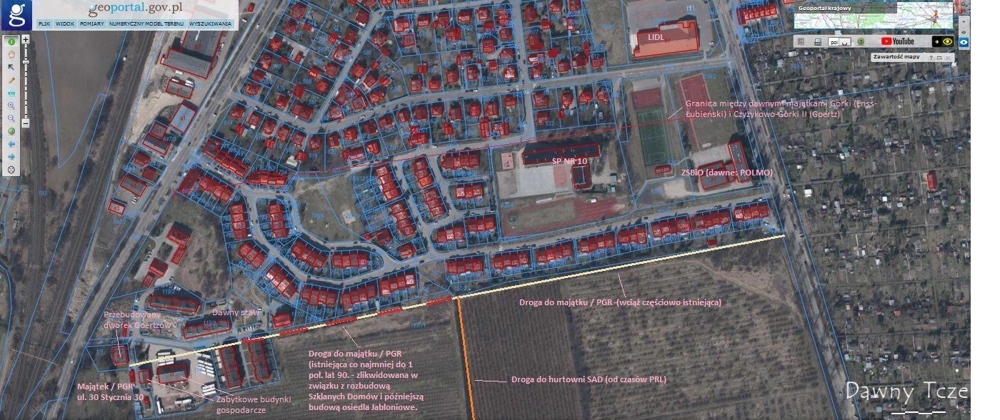 Dodam jeszcze, że układ części działek geodezyjnych po stronie ogródków działkowych nie zmienił się znacząco od czasów przedwojennych. Dzięki temu z drugiej strony Bałdowskiej można dokładnie wytyczyć granicę (wąska, czerwona linia) między dawnym majątkiem Górki a majątkiem Grohnów-Goertzów, która niemal dokładnie (poza kilkoma wyjątkami na końcu ul. W. Pola) przebiega na granicy między starym osiedlem Bema a nowym, czyli Szklanymi Domami, o czym zresztą była już wstępnie mowa tu: https://dawnytczew.pl/forum/viewtopic.p ... =20#p65149.