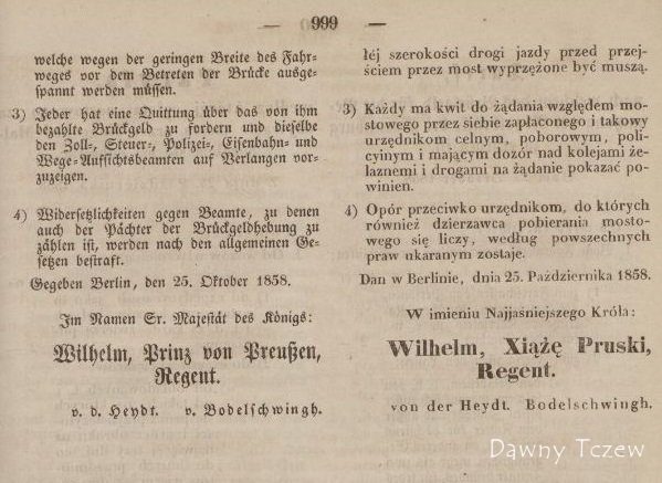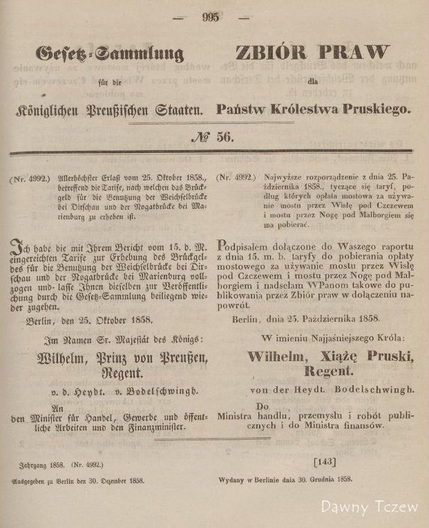 "Gesetzsammlung für die Königlichen Preußischen Staaten", czyli "Zbiór Praw dla Państw Królestwa Pruskiego" (nr 56, 1858 r.) "pod Czczewem" i "mostu przez Nogę"