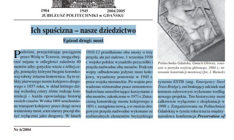 W piśmie Politechniki Gdańskiej z 2004 roku znajdziemy świetny artykuł Waldemara Affelta o historii powstania mostów, mnie szczególnie zainteresowało posadowienie filarów. Na urodziny mostu -wiadomości w pigułce-raz jeszcze...