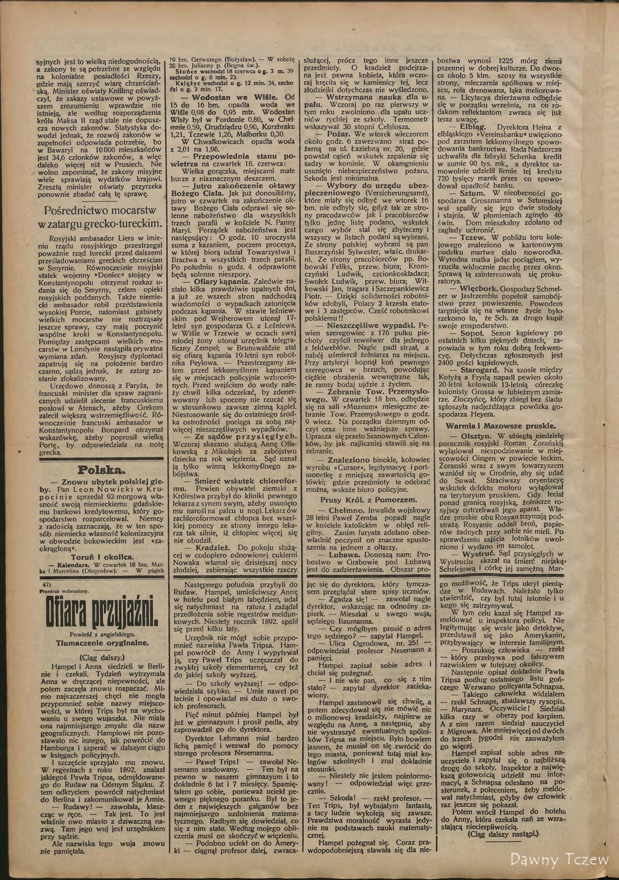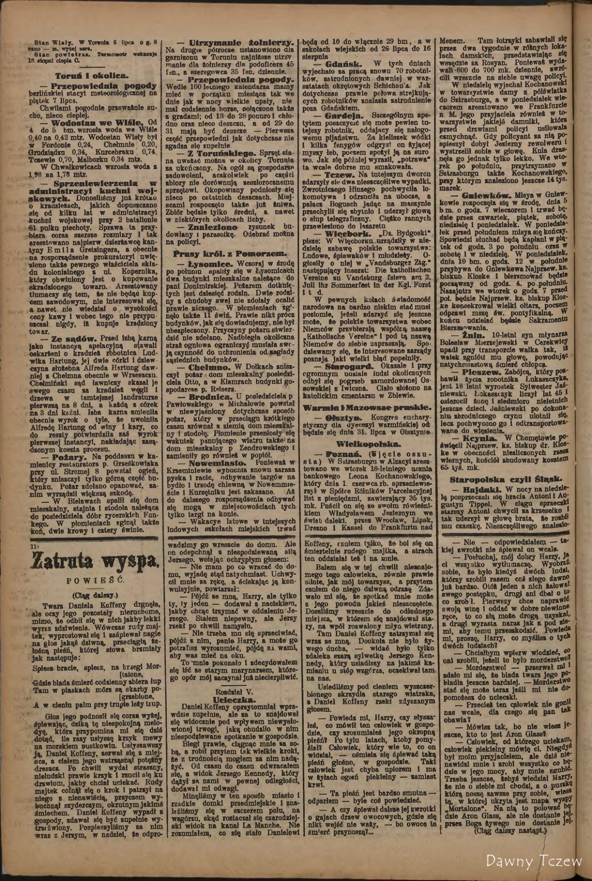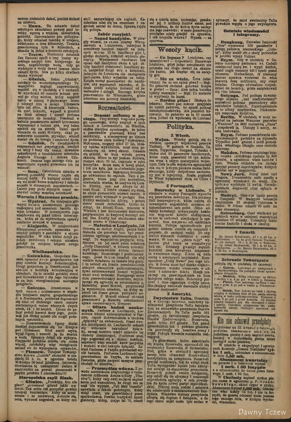 — Tczew. W pobliżu toru kolejowego znaleziono w kartonowym pudełku martwe ciało noworodka. Wyrodna matka jadąc pociągiem, wyrzuciła widocznie paczkę przez okno. Sprawą tą zainteresowała się prokuratorya.